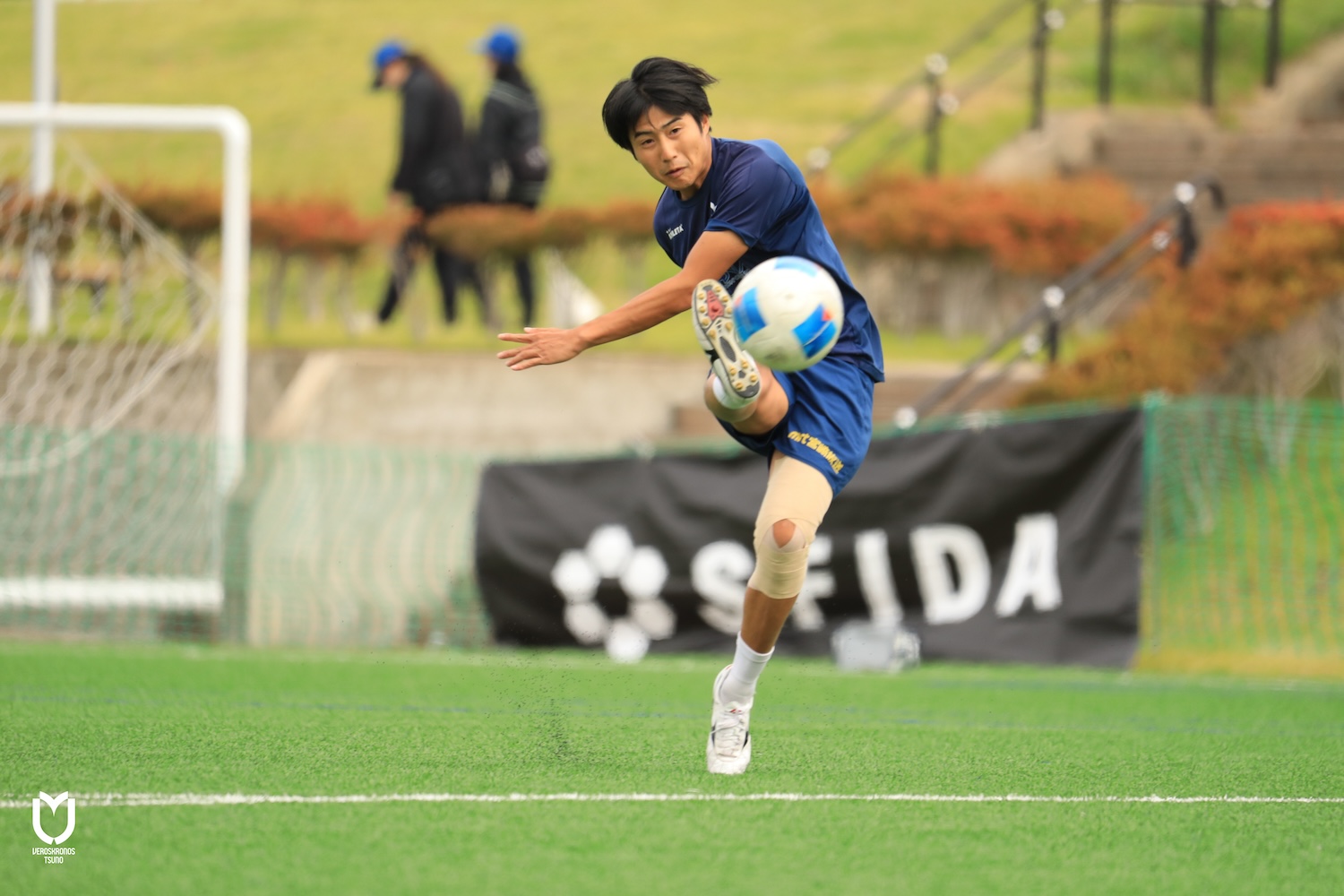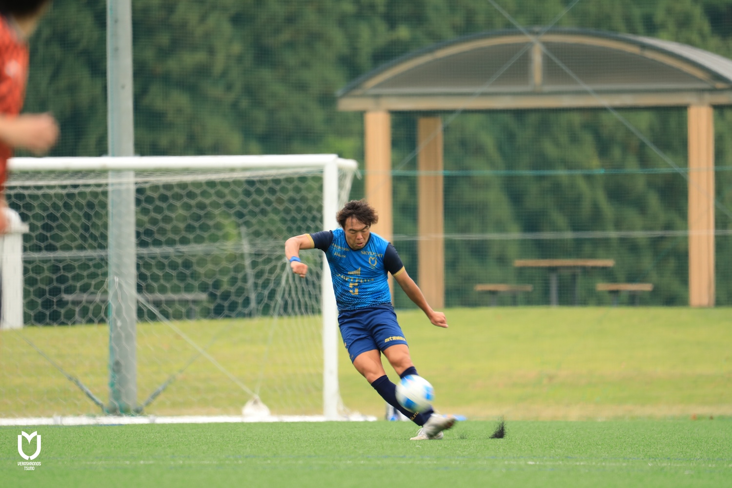 ヴェロスクロノス都農は立ち上がりから攻守にわたってリズム良くゲームを進め、柳田健太選手、山原慧也選手、井上将弥選手のDF陣が長短を織り交ぜながらのボールを前線に送って揺さぶりを掛け、的確な守備も繰り出しながらボールを握ります。開始早々に好機を作り、山原選手が右ウイングのFW酒井信磨選手に繋いだ後、抜群のタイミングで受けたFW上米良柊人選手が相手DFをかわして両チームを通じて初のシュート。惜しくもポストを叩きましたが、序盤から効果的にプレッシャーを掛けながら試合を展開しました。10分過ぎからは相手にボールを持たれる時間帯が訪れ、素早くラインを押し上げようとする相手に対し、FW、MF陣が組織となってスペースを埋め、最終ラインの山原選手、井上選手、柳田選手と連動しながら自陣深くまでの侵入を断ってシュートまで持ち込ませず、堅実で粘り強い守りから流れを引き戻します。