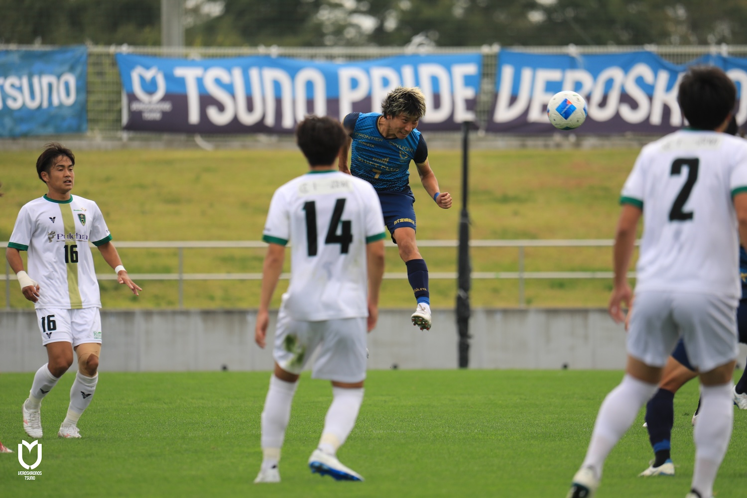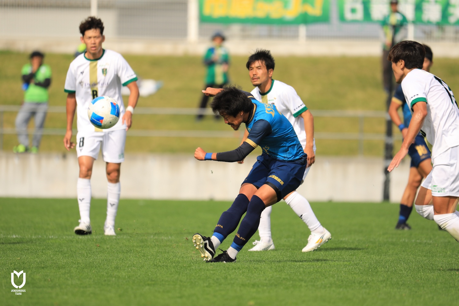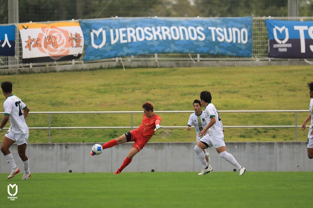 前半風上に立ったヴェロスクロノス都農は組織となった積極的で粘り強いディフェンスから流れを掴みます。前線ではFWの山田雄太選手、上米良柊人選手、松本幹太選手、酒井信磨選手が相手のスペースを鋭い動き出しで埋め、両ボランチの永野雄大選手、山内彰選手もしつこくボールに絡み続けました。後方では山原慧也選手、井上将弥選手、柳田健太選手、高橋健選手のDF陣が素早く体を寄せて自陣深くまでの侵入を許さず、奪い返したボールを後方で散らしながら両ボランチを経由させてバリエーション豊かに前進を図りました。