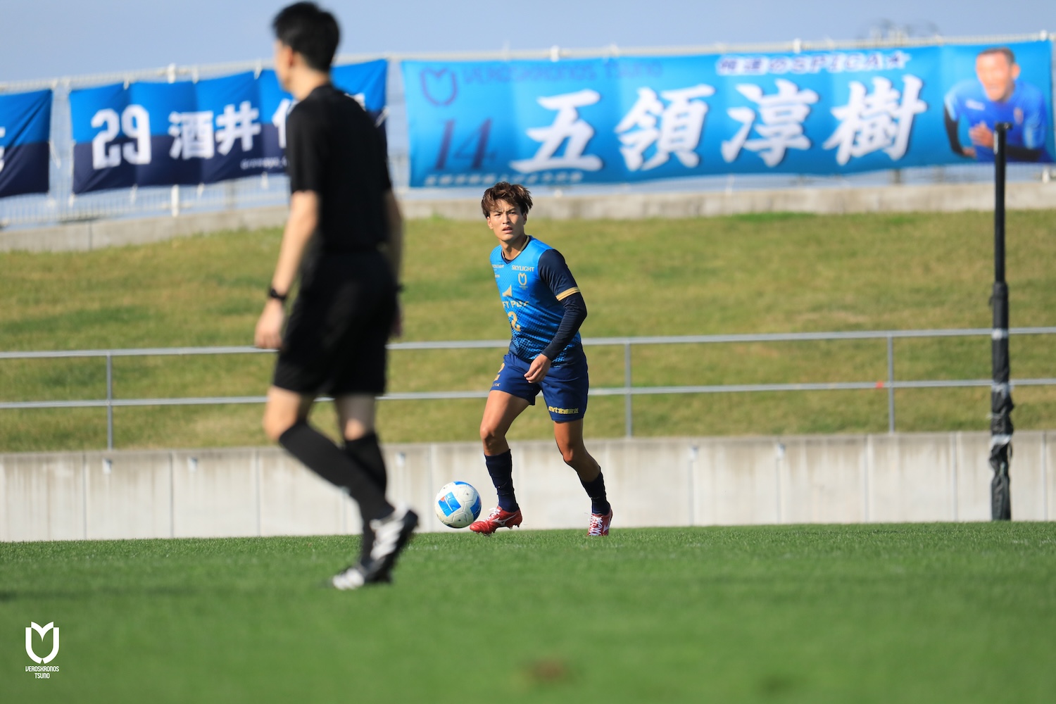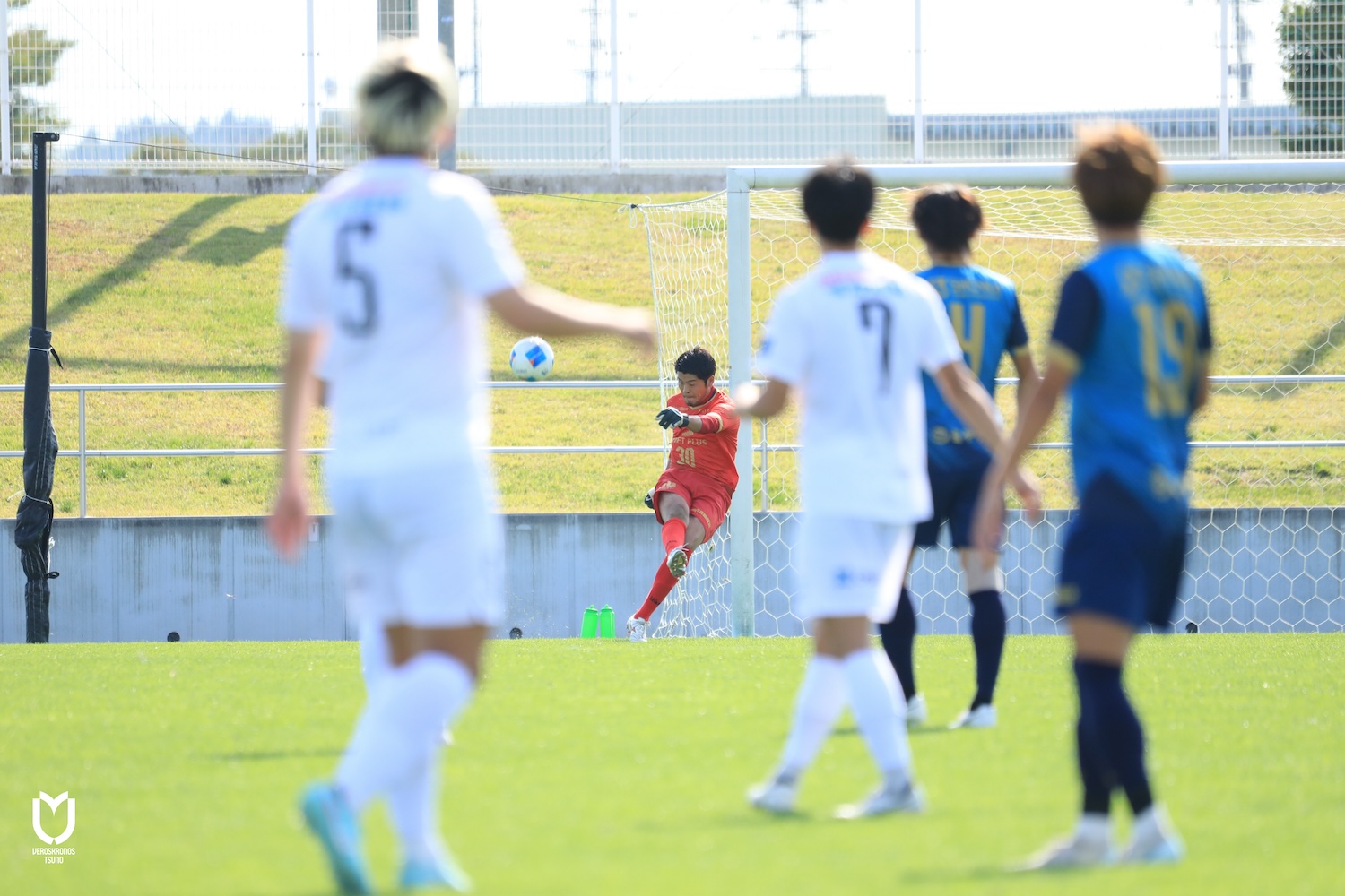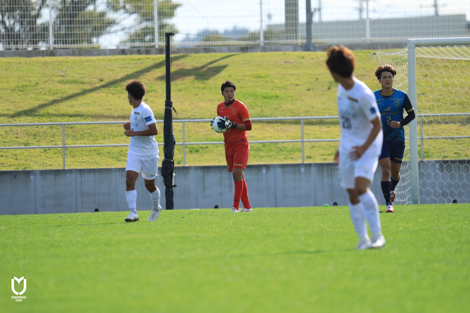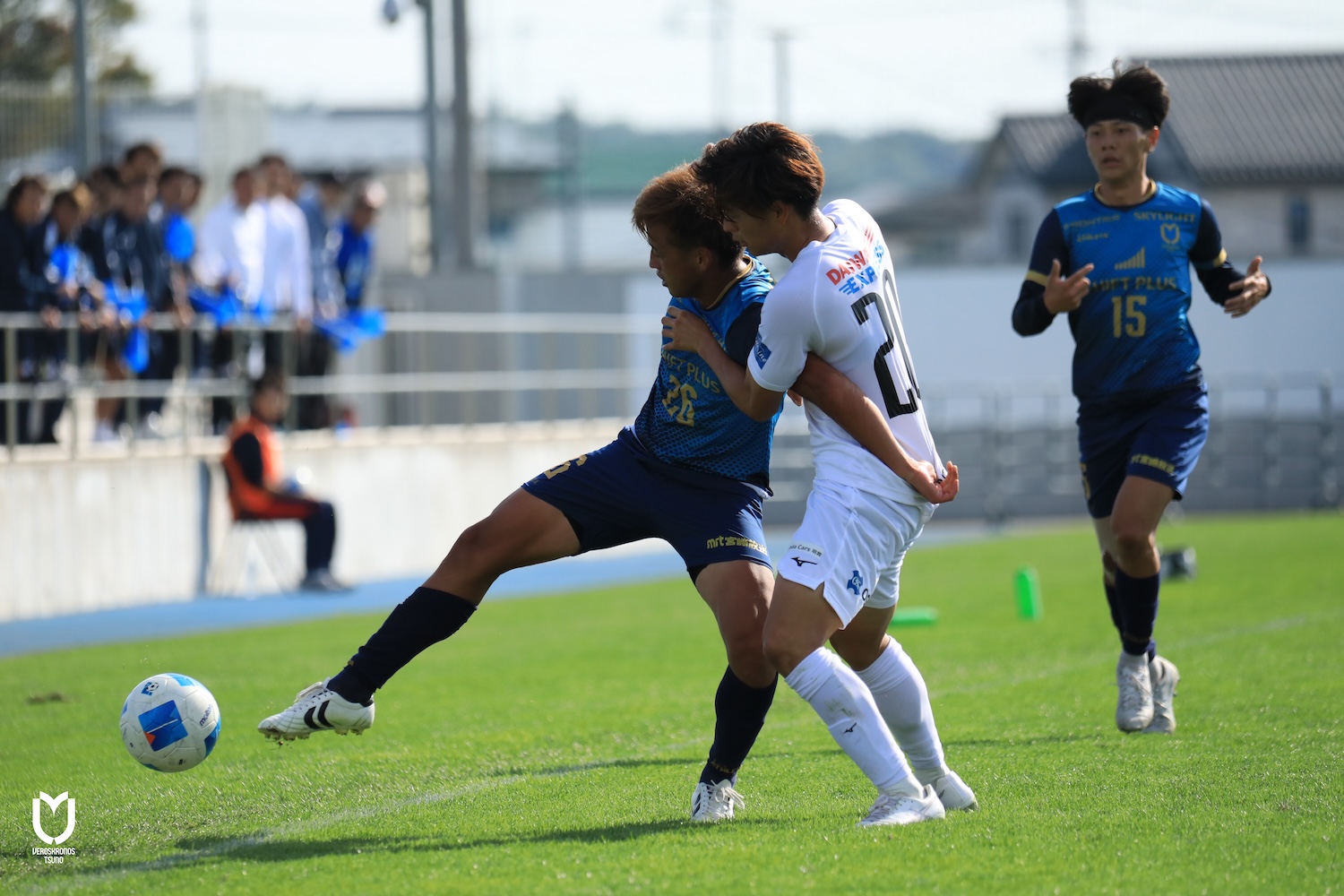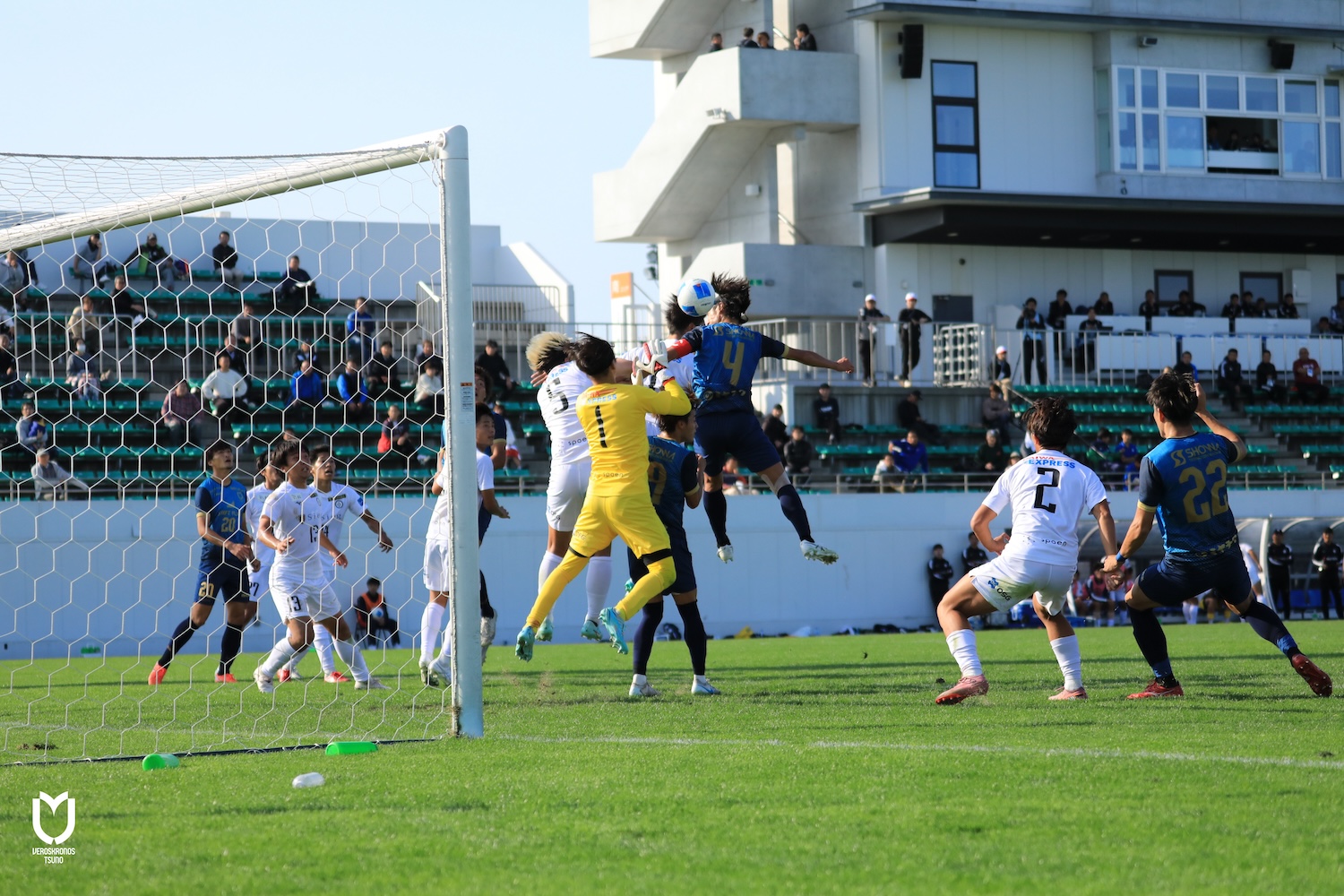 縦を突かれてピンチの場面も次々と訪れましたが、久野選手や武田選手、GK浅井大地選手らが懸命に踏ん張ってゴールを守り、終了間際の相手連続攻撃の場面ではロングスローから枠を捉えられたシュートを五領選手が足を伸ばして食い止めるなど、組織となったディフェンスを徹底してリードを保ったまま折り返しました。