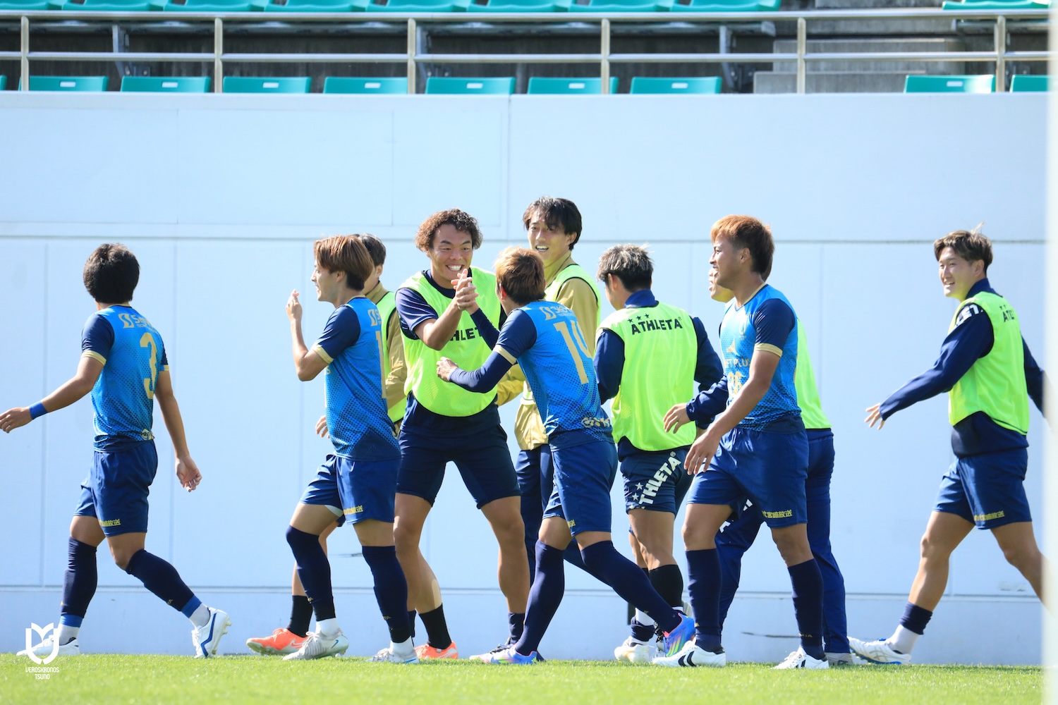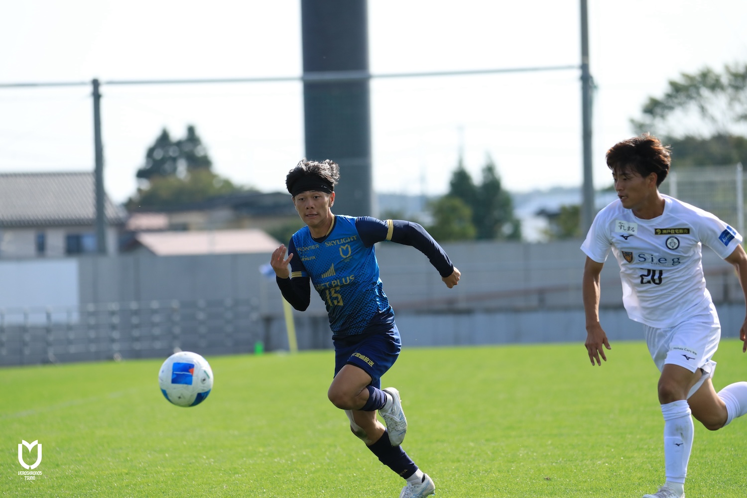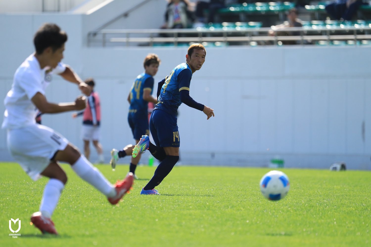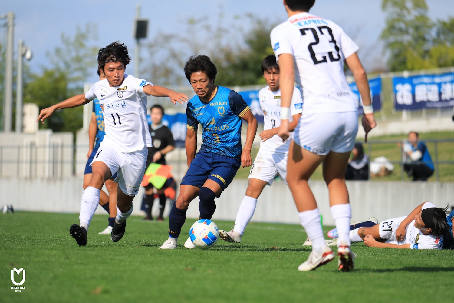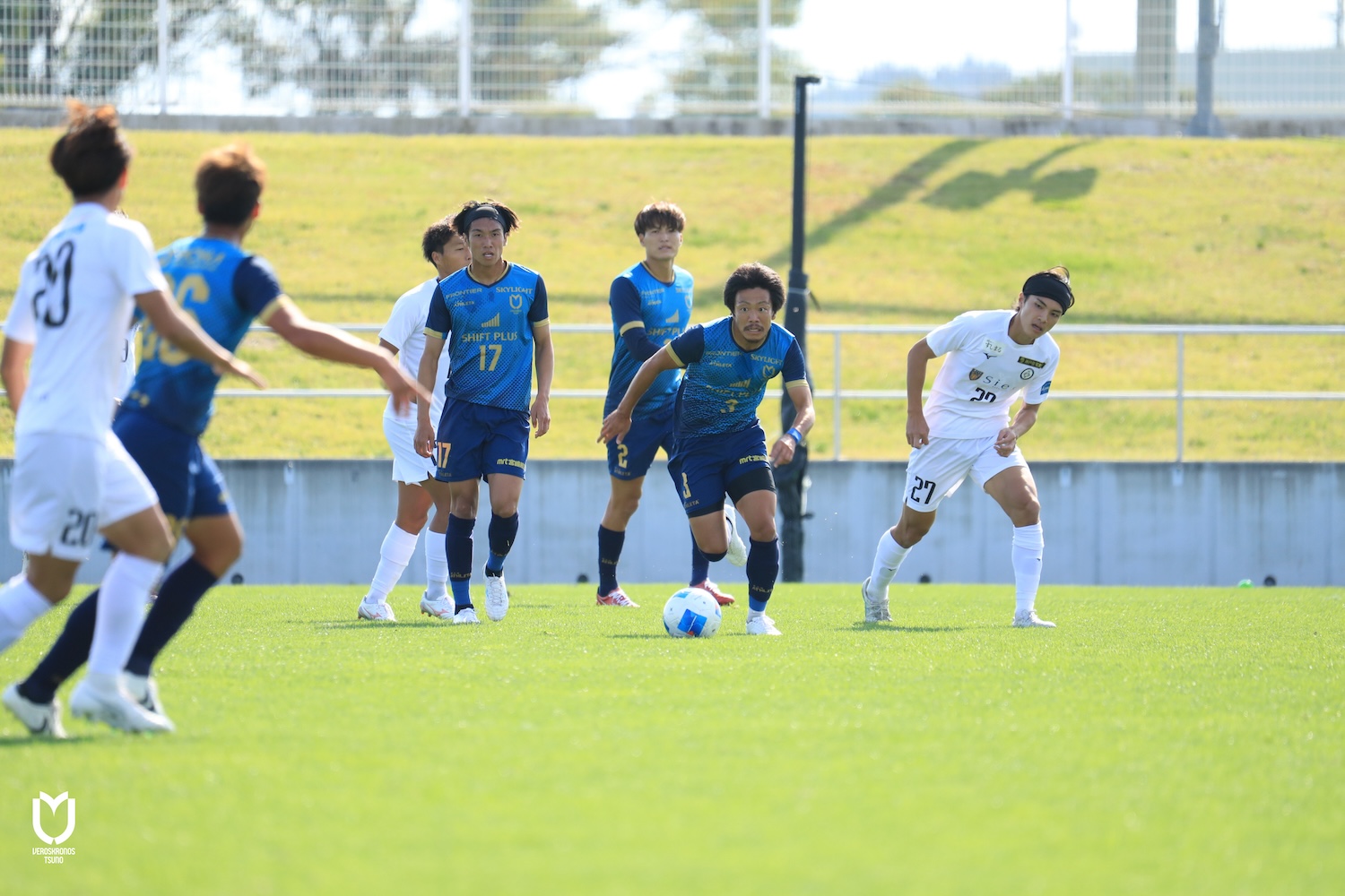 縦を突かれてピンチの場面も次々と訪れましたが、久野選手や武田選手、GK浅井大地選手らが懸命に踏ん張ってゴールを守り、終了間際の相手連続攻撃の場面ではロングスローから枠を捉えられたシュートを五領選手が足を伸ばして食い止めるなど、組織となったディフェンスを徹底してリードを保ったまま折り返しました。