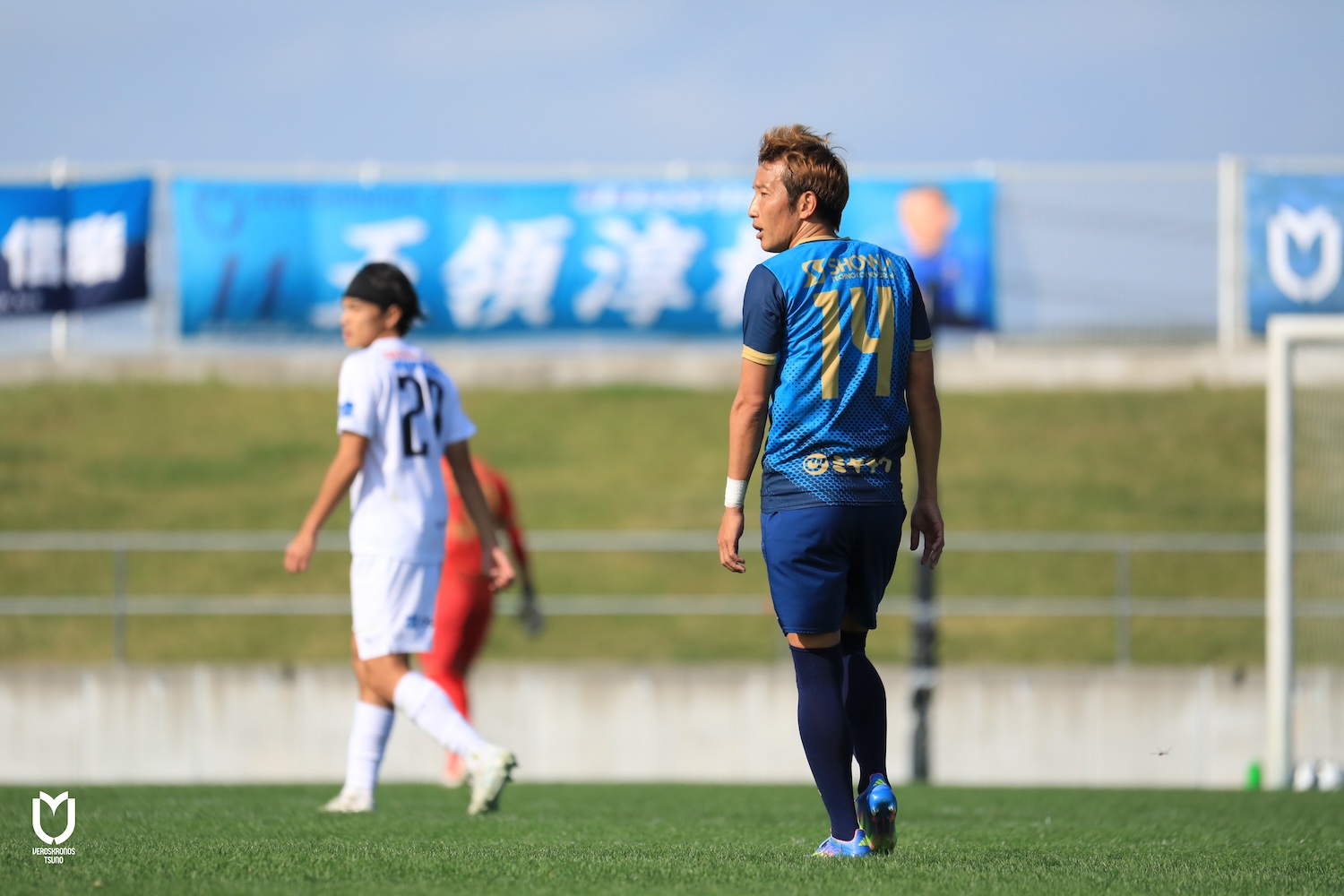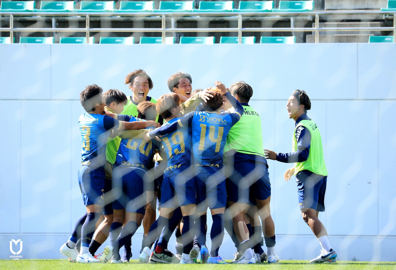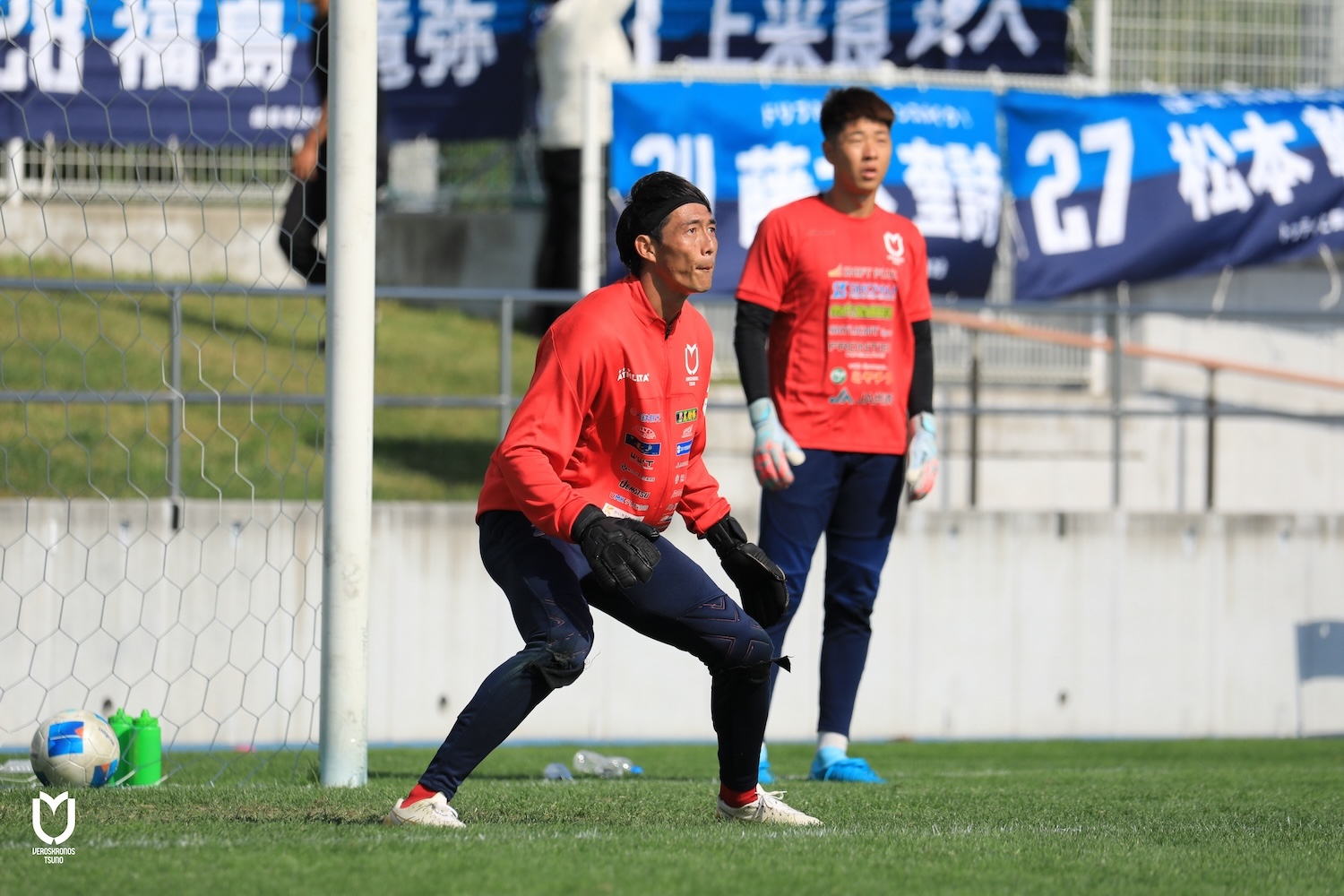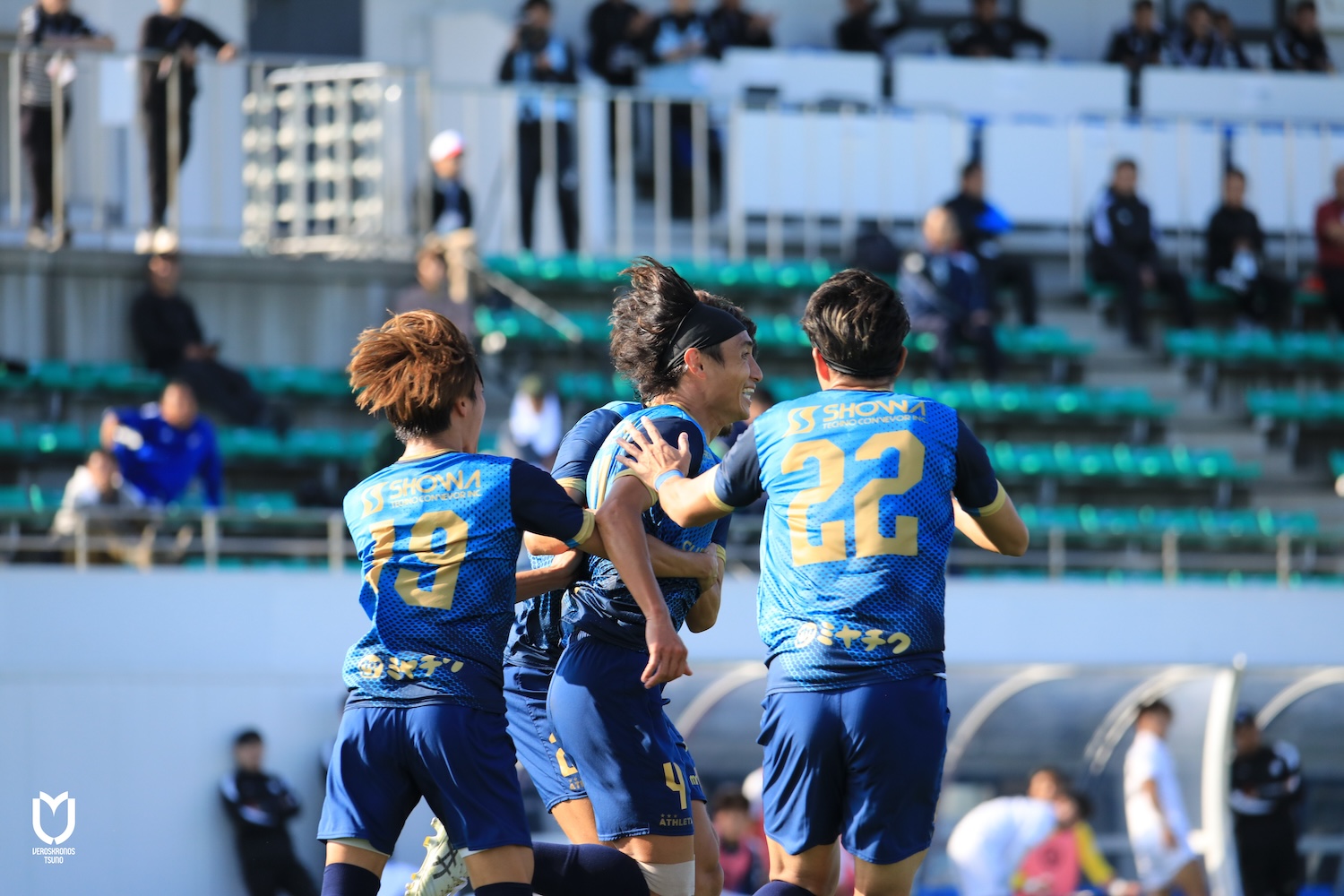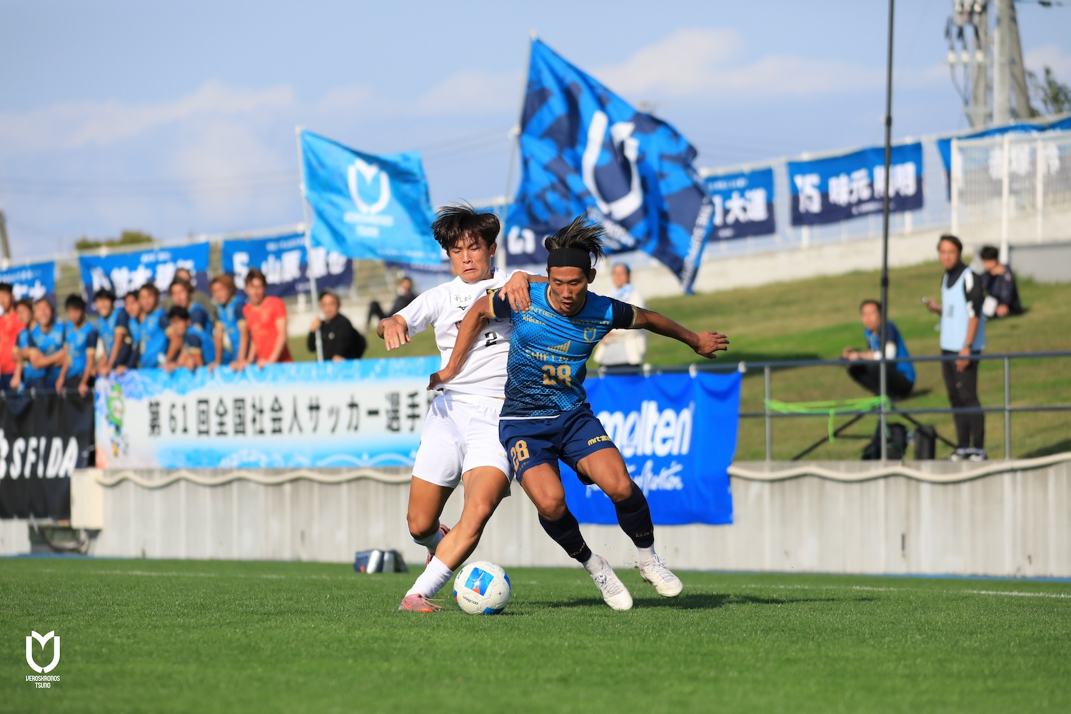 縦を突かれてピンチの場面も次々と訪れましたが、久野選手や武田選手、GK浅井大地選手らが懸命に踏ん張ってゴールを守り、終了間際の相手連続攻撃の場面ではロングスローから枠を捉えられたシュートを五領選手が足を伸ばして食い止めるなど、組織となったディフェンスを徹底してリードを保ったまま折り返しました。