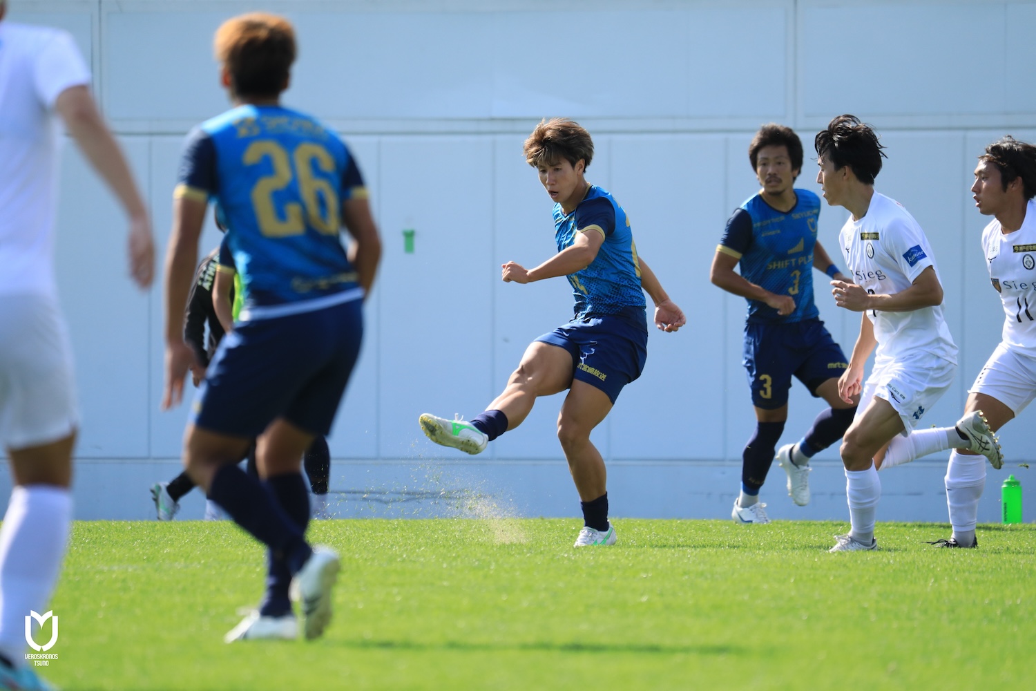 後半は統一して攻撃の立て直しを意識し、積極的にボールに絡んで保持率アップを図ると、テンポの良い前進を繰り広げる時間帯が増え始めました。5分過ぎには梶山選手、武田選手、松岡選手がボールを散らし、五領選手、藤本選手、永吉選手らが鮮やかに繋いで味元選手がシュートを放ちます。