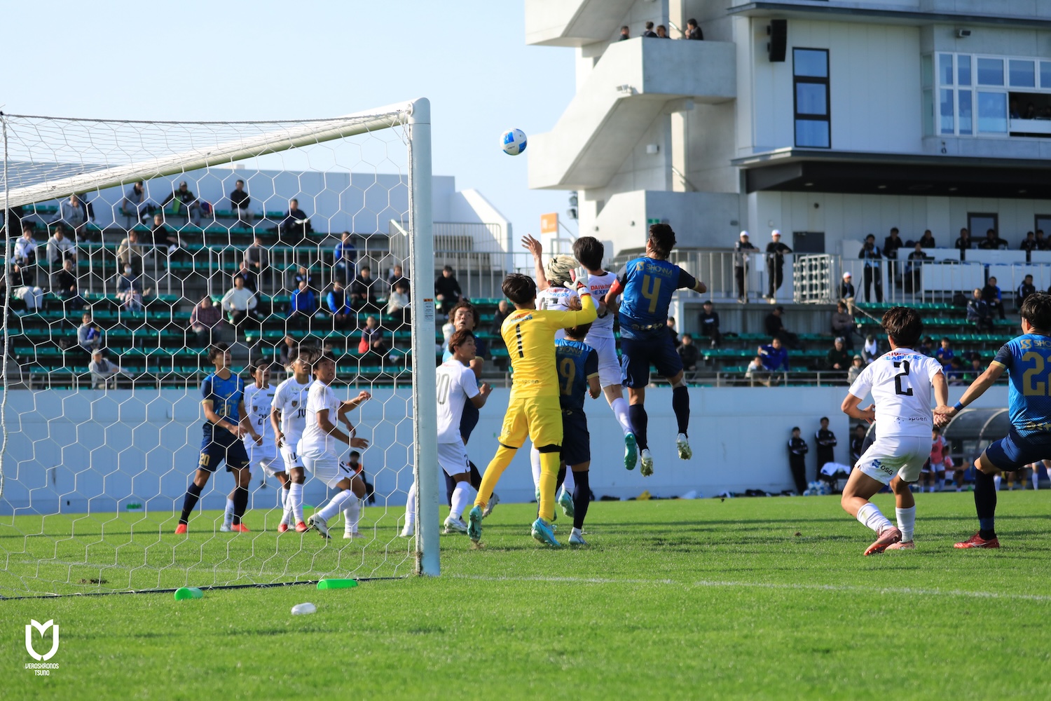 キッカーは永吉選手が務め、ファーサイドに狙いを定めて蹴り込んだボールに松岡選手が反応し、相手DFのブロックを力強い動きで跳ね返して頭で勝ち越しのゴールを奪いました。
