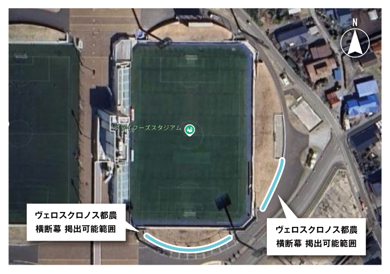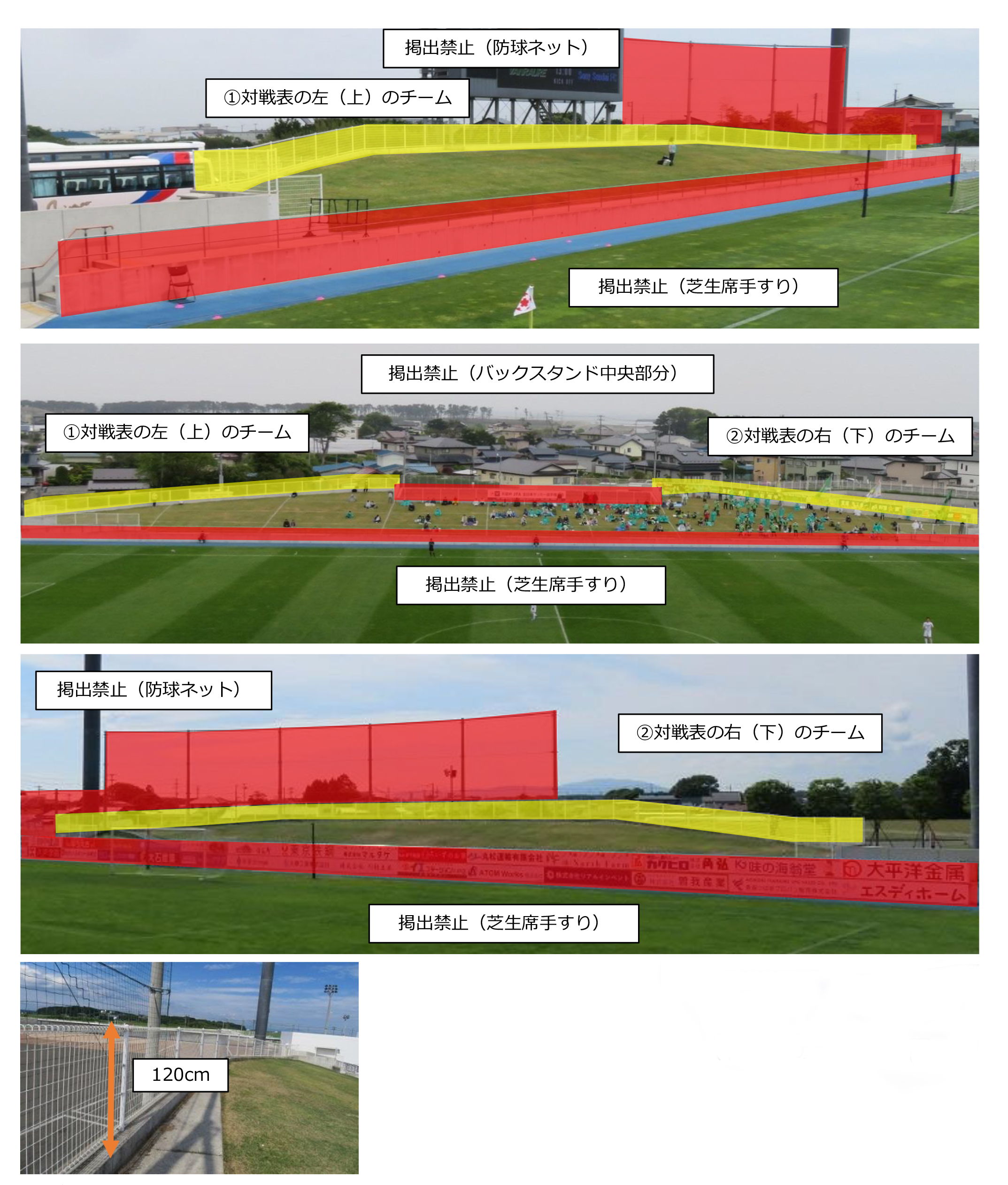 ・掲出可能範囲は芝生スタンドのメッシュフェンス(青枠内)のみです。