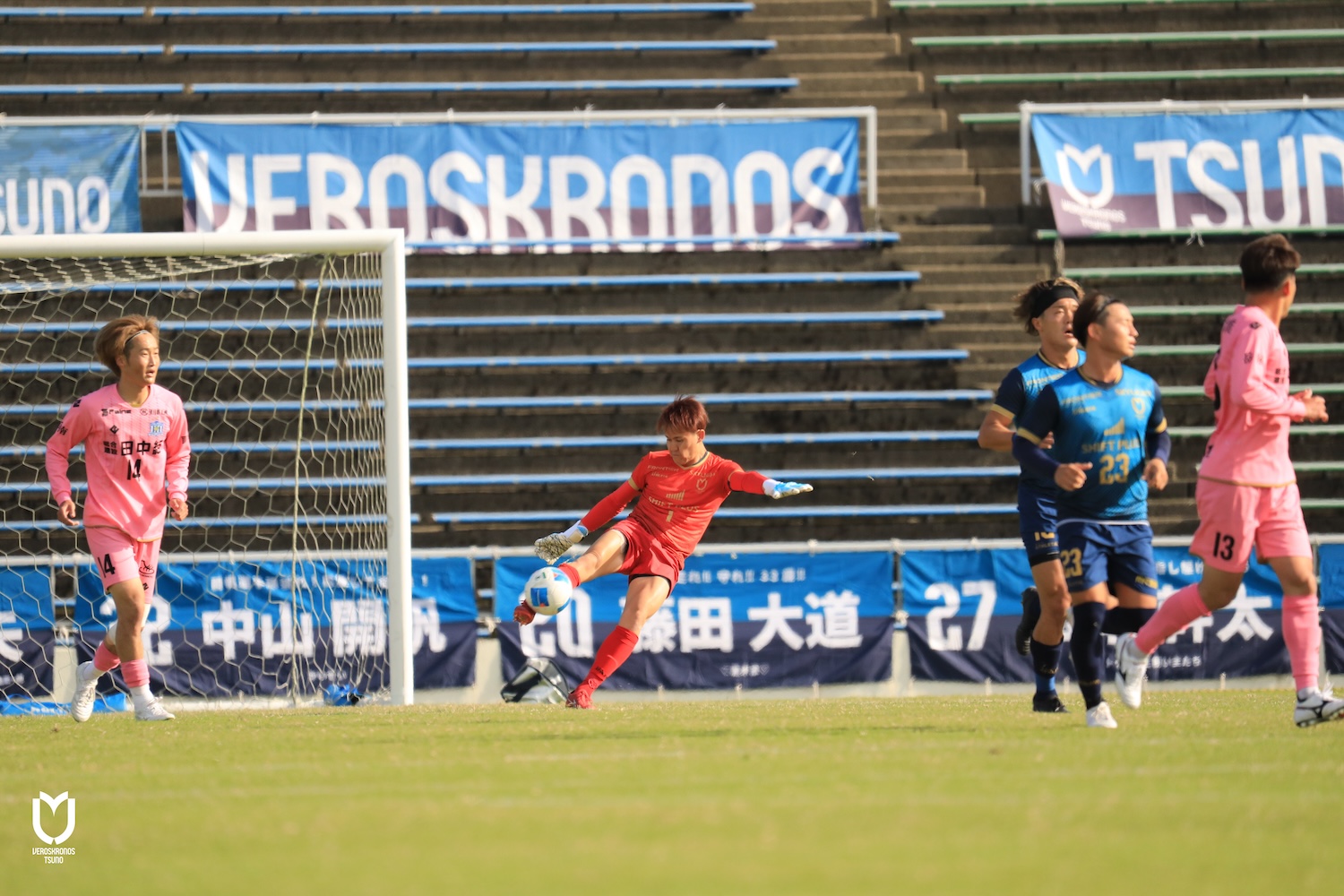 DF山原慧也選手がMF中村亮選手に繋ぎ、MF山内彰選手が前進させた後、DF藤本奎詩選手を経由して中村選手がクロスボールを蹴り込んで圧力を掛け、さらにGK赤塚怜選手、山内選手、山原選手、FW山田雄太選手の素早い連係からの好機も生み出します。