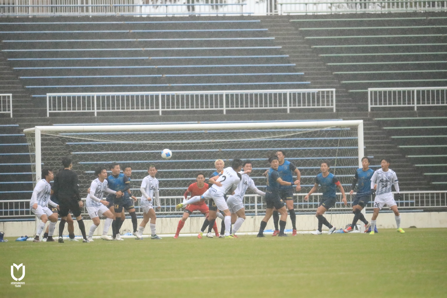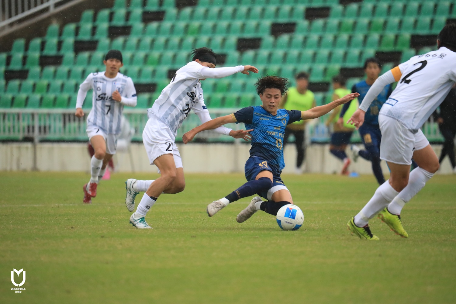 しかし、19分の右サイドを崩された後のクロスボールに反応が遅れてヘディングシュートで同点ゴールを決められました。今大会初の手痛い失点となり、それ以降も相手の勢いを中々食い止めることが出来ずに揺さぶられます。苦しい時間帯を再び耐え抜くと、徐々にボール保持率が高まり、FWの上米良柊人選手、酒井信磨選手の攻撃的なプレーヤーを投入した後の30分ごろからの連続攻撃で活路を見出しました。中村選手が放ったシュートからのセカンドボールを山原選手が回収し、井上選手、山内選手、永野選手、藤本選手と連動しながらのボールの出し入れを繰り返してスペースを探り、左サイドで効果的な動き出しを見せた中村選手にスルーパスを送り込むと、相手のファウルを誘いました。好位置からのFKを獲得し、キッカー柳田選手が放ったファーサイドへのボールはゴールに吸い込まれるかのような軌道を取り、井上選手がその落下点に合わせて流れるような動きを見せて頭で勝ち越しゴールを挙げました。