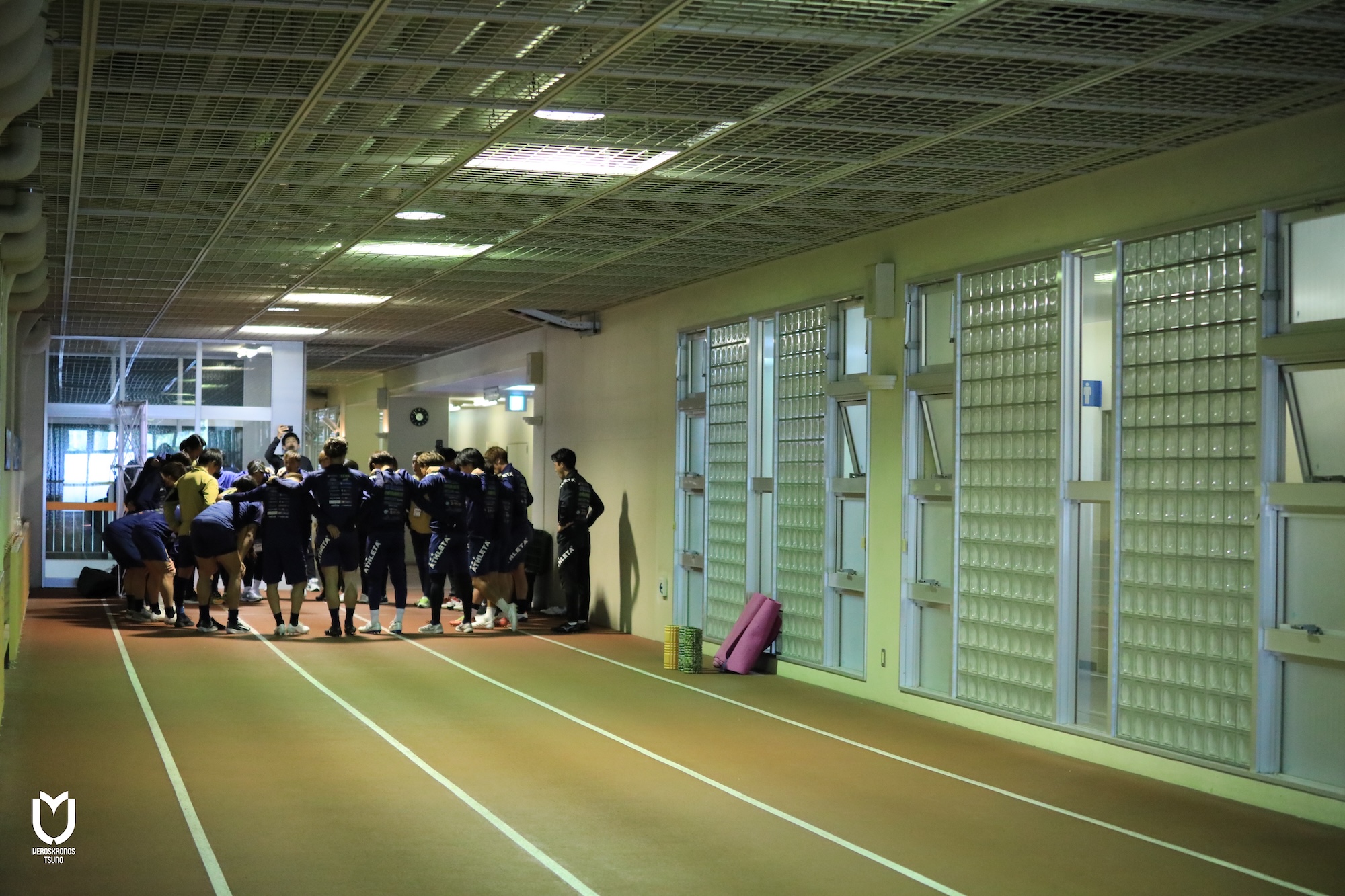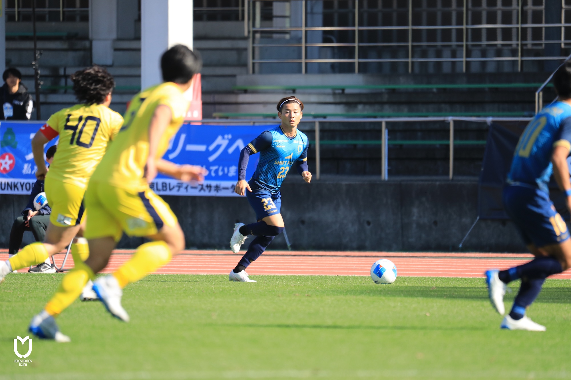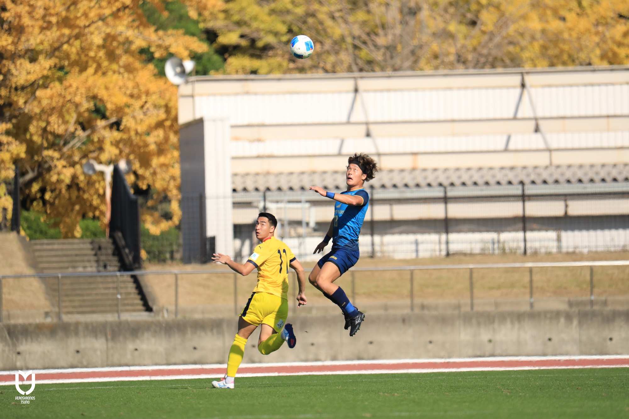 10分に右サイドバックの要DF柳田健太選手が足を痛めて途中交代を余儀なくされるアクシデントに見舞われましたが、攻守の流れは失うことなく、永野選手と酒井選手の巧みな動きでゴールに迫るなど先制ゴールに向けたいい攻撃の形を積み上げました。迎えた34分、永野選手、山内選手のスペースを突く動きから右サイドで攻めた酒井選手が右CKを獲得します。キッカー永野選手が放ったボールはファーサイドへと左カーブの軌道を描き、高さのある山原選手らの頭上を越えたボールの落下点を後方で冷静に見極めたFW鈴木琉矢選手が左足で放ったダイレクトシュートは、鋭く低い弾道でゴール中央を捉えました。先制点を奪って以降も堅守からの攻撃を徹底し、終了間際には酒井選手とFW山田雄太選手でゴールまであと一歩に迫るなど、奪った主導権を手放すことなくハーフタイムに入りました。