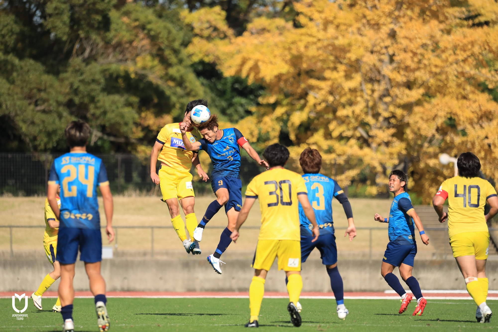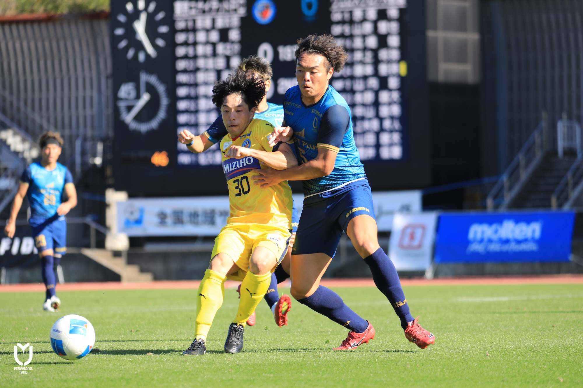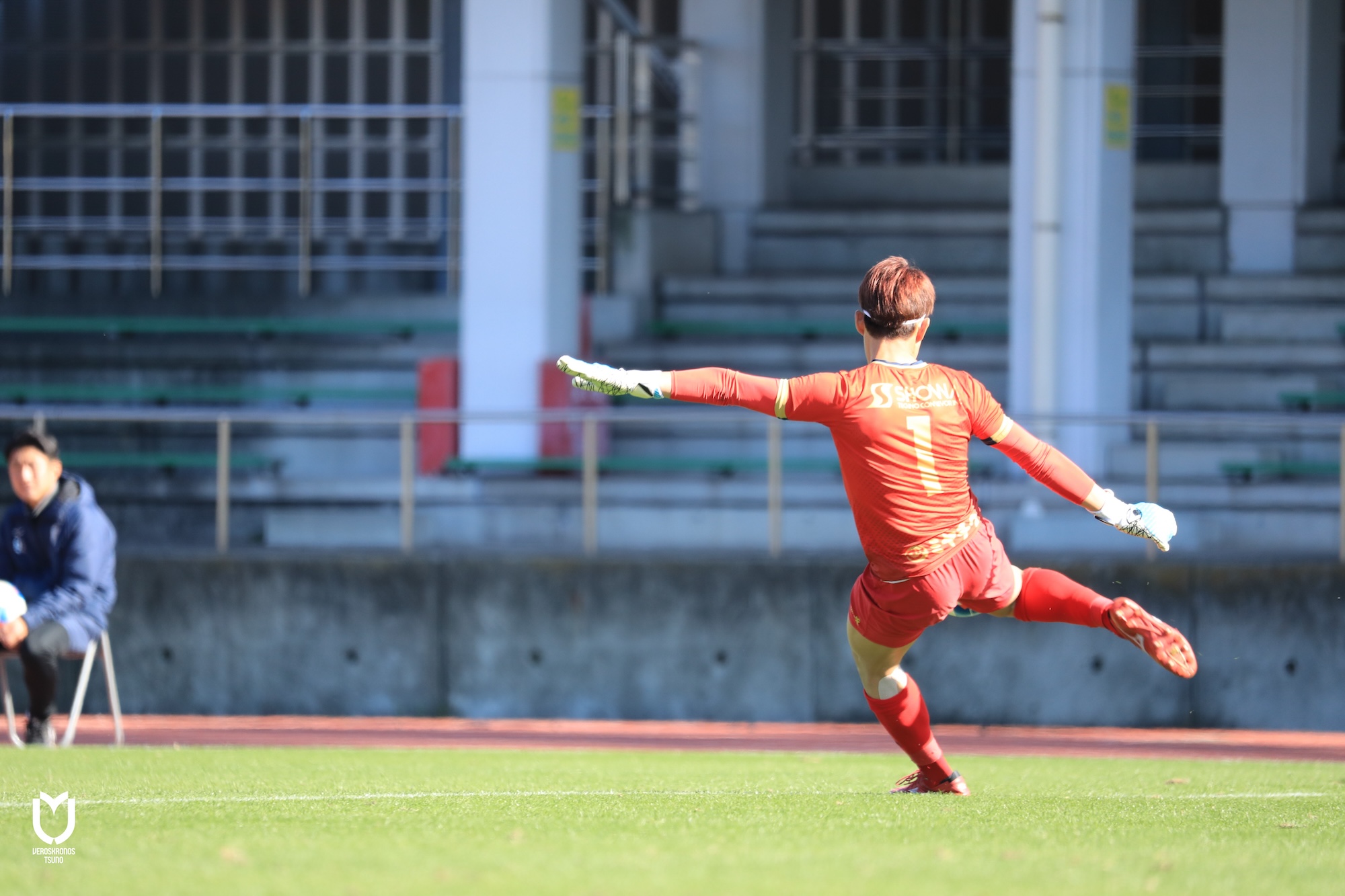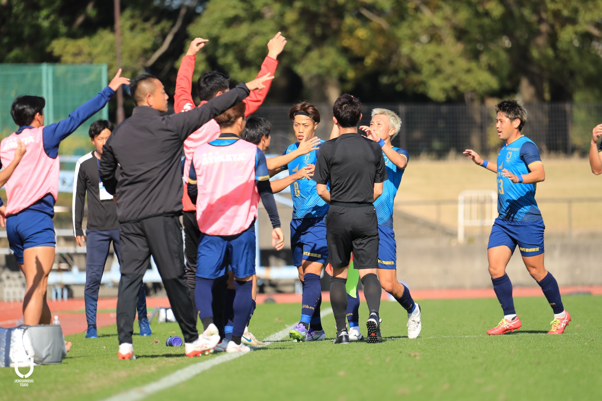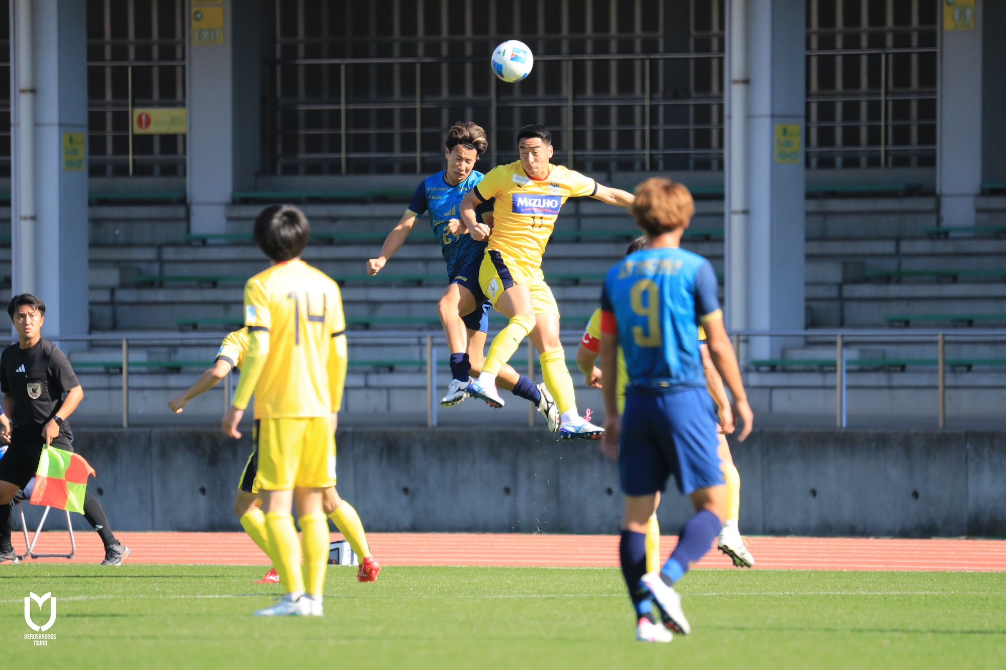 後半は入りこそ一進一退の攻防に持ち込みましたが、攻撃的な選手を投入した相手に徐々に流れが傾きます。左右に揺さぶられてゴール前にクロスを放り込まれ、アタックのセカンドボールを奪われてカウンター攻撃を浴びるなど、10分頃からはディフェンスの連続を強いられました。思い通りにボールを支配することが出来ない苦しい展開となりましたが、積み上げてきた堅守は崩れず、DF高橋健選手、井上選手、山原選手が的確なポジショニングでシュートコースを狭めながらクロスボールも弾き返し、ペナルティーエリア内に持ち込まれた際には永野選手や鈴木選手が懸命に足を伸ばしてブロックしました。打たれたシュートに対してはGK赤塚怜選手が冷静な判断力を見せてビッグセーブを連発すると、ゴール前の混戦も11人が一体となって集中力を切らすことなく跳ね返し続けました。