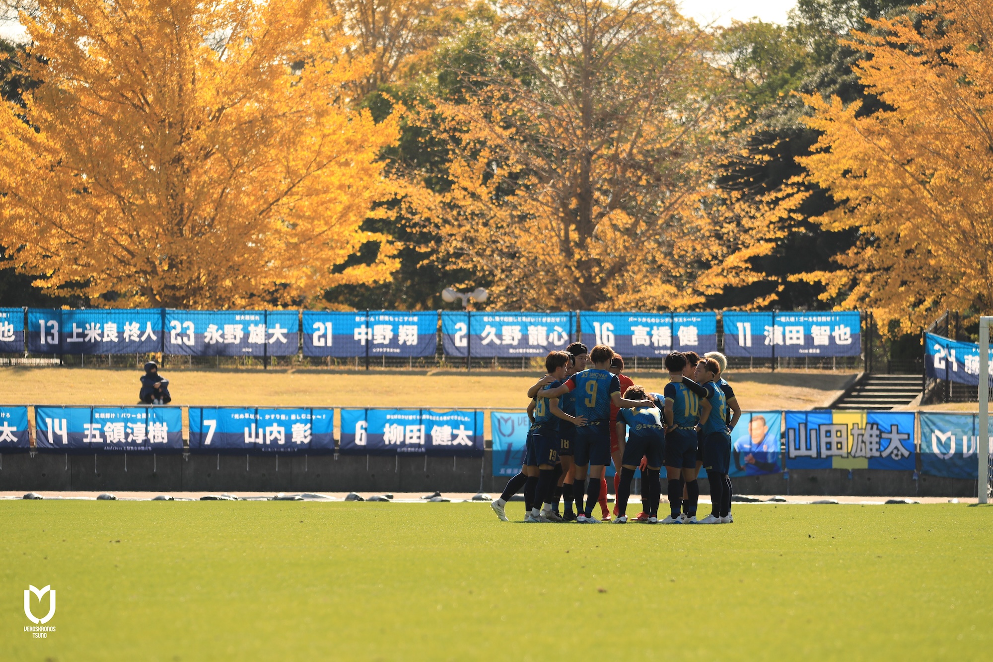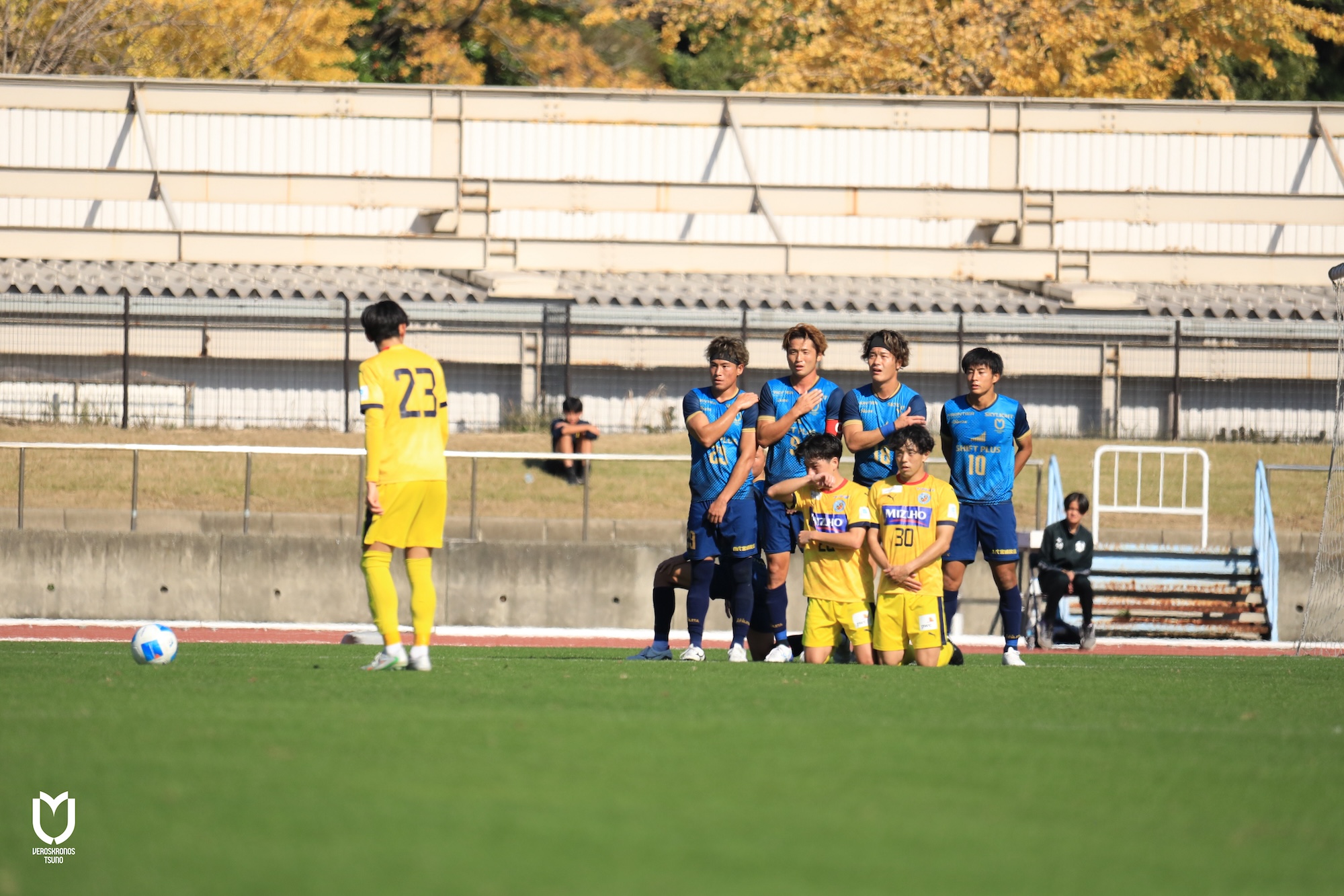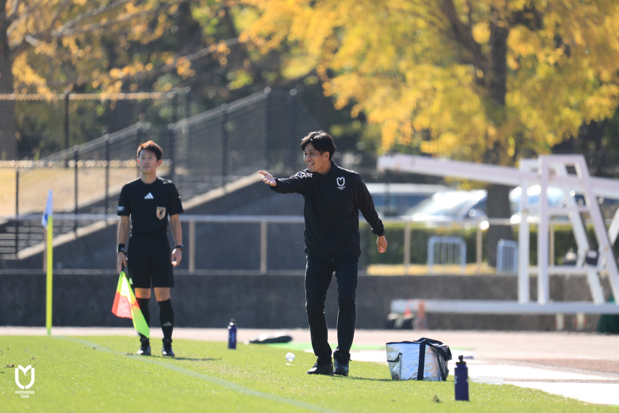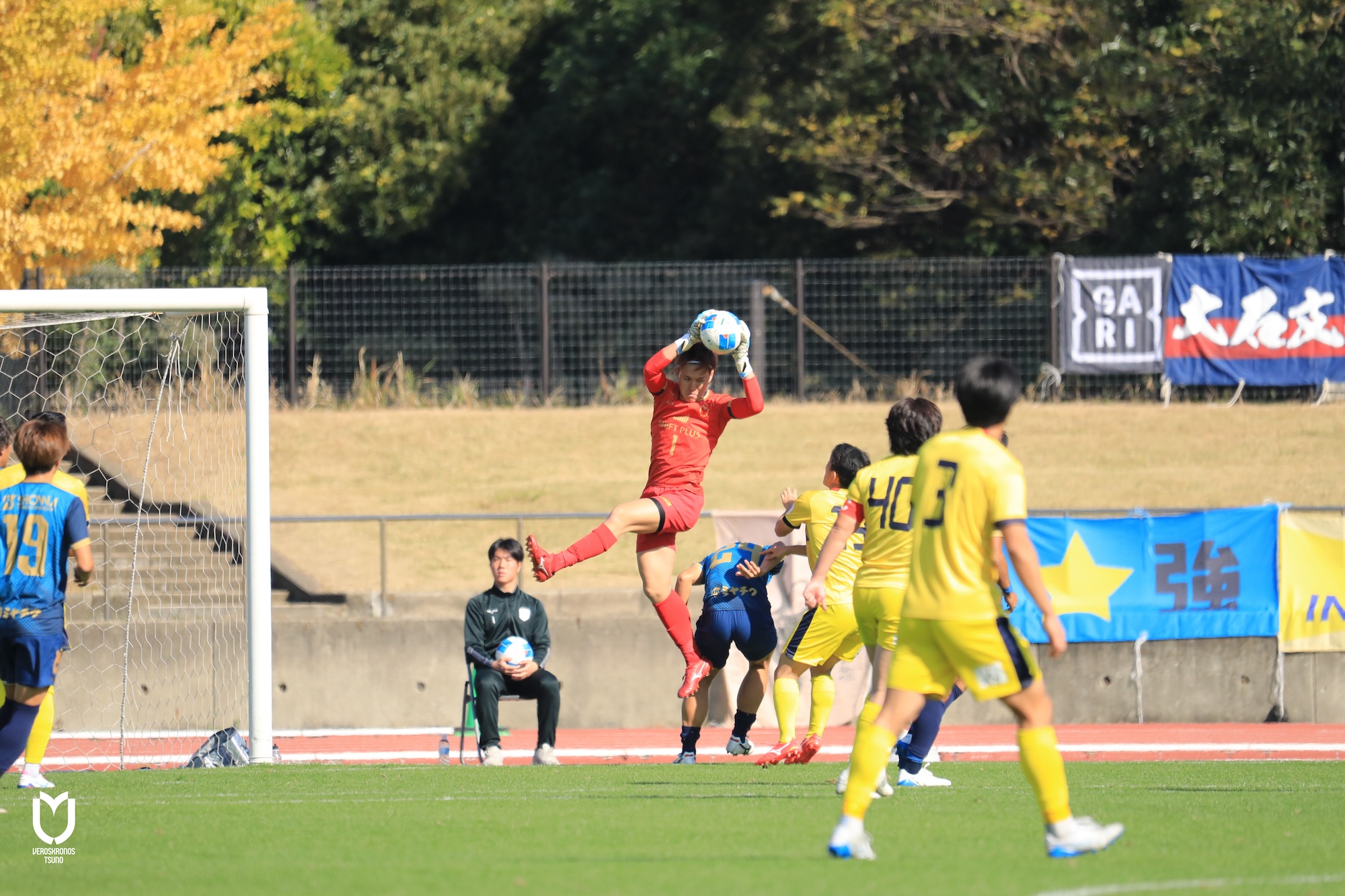 後半は入りこそ一進一退の攻防に持ち込みましたが、攻撃的な選手を投入した相手に徐々に流れが傾きます。左右に揺さぶられてゴール前にクロスを放り込まれ、アタックのセカンドボールを奪われてカウンター攻撃を浴びるなど、10分頃からはディフェンスの連続を強いられました。思い通りにボールを支配することが出来ない苦しい展開となりましたが、積み上げてきた堅守は崩れず、DF高橋健選手、井上選手、山原選手が的確なポジショニングでシュートコースを狭めながらクロスボールも弾き返し、ペナルティーエリア内に持ち込まれた際には永野選手や鈴木選手が懸命に足を伸ばしてブロックしました。打たれたシュートに対してはGK赤塚怜選手が冷静な判断力を見せてビッグセーブを連発すると、ゴール前の混戦も11人が一体となって集中力を切らすことなく跳ね返し続けました。