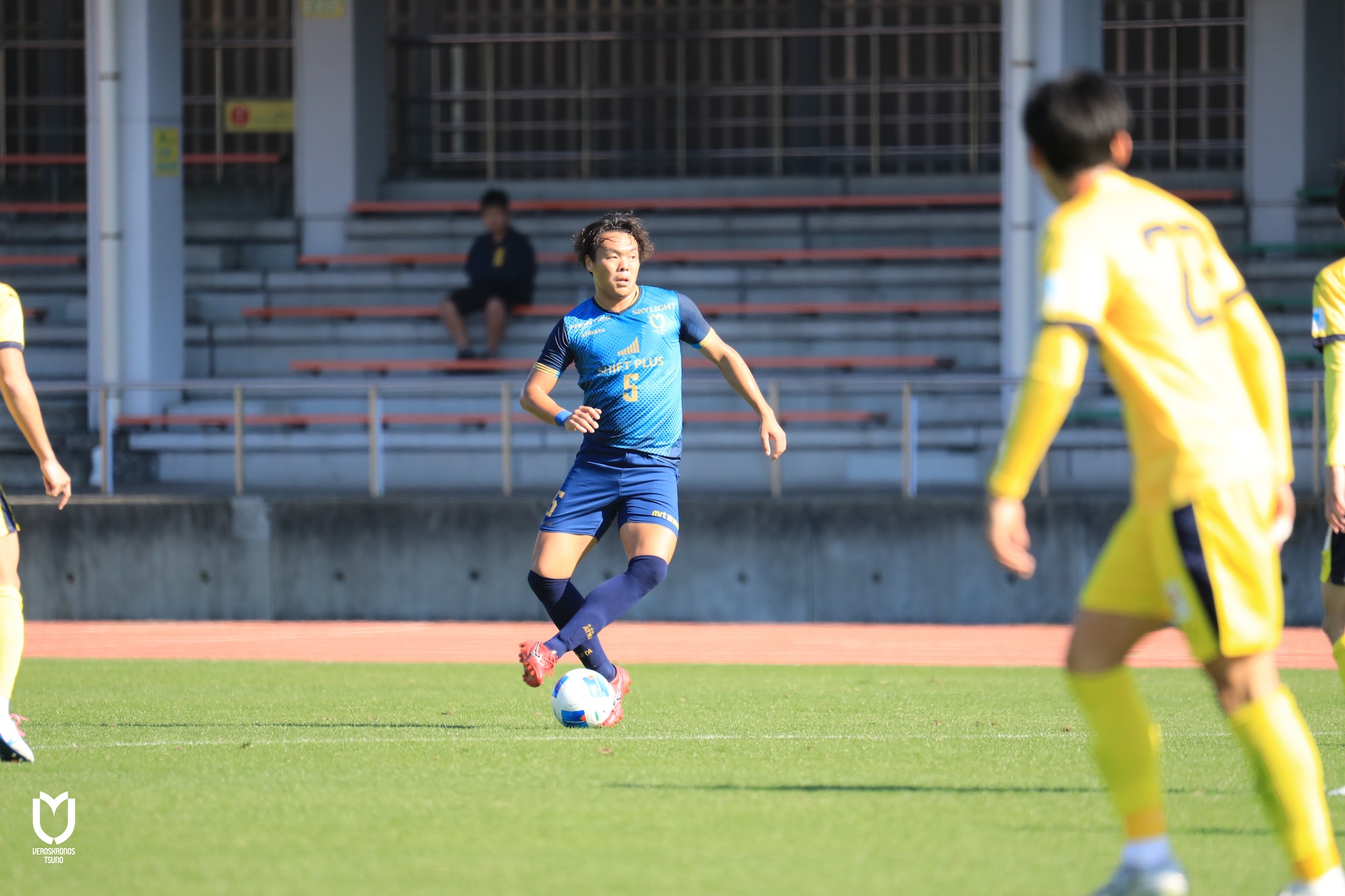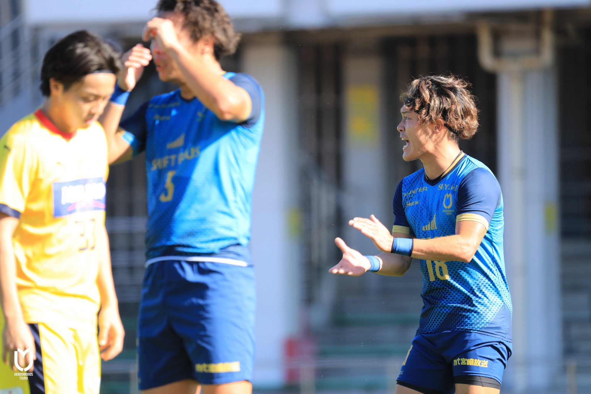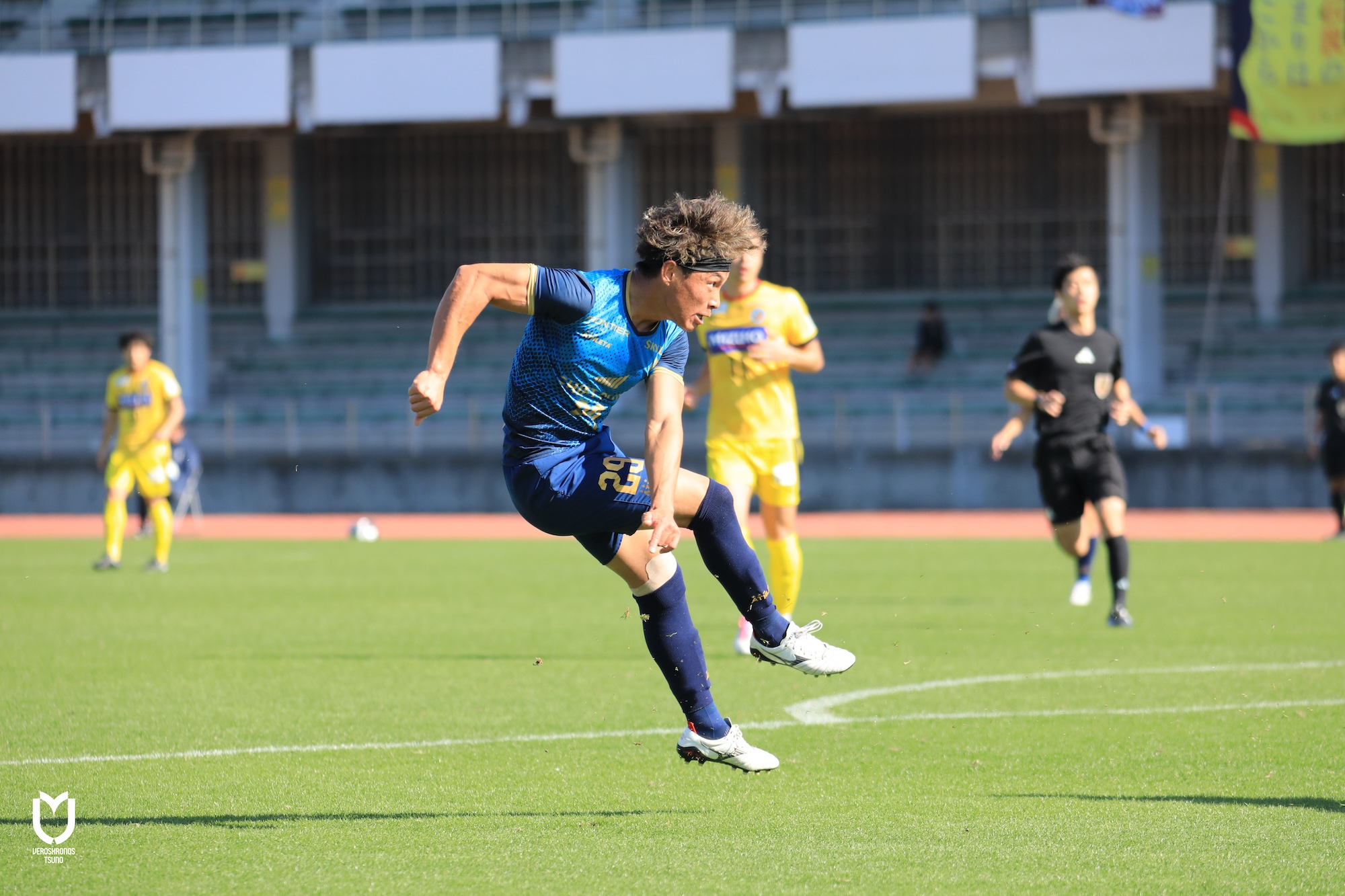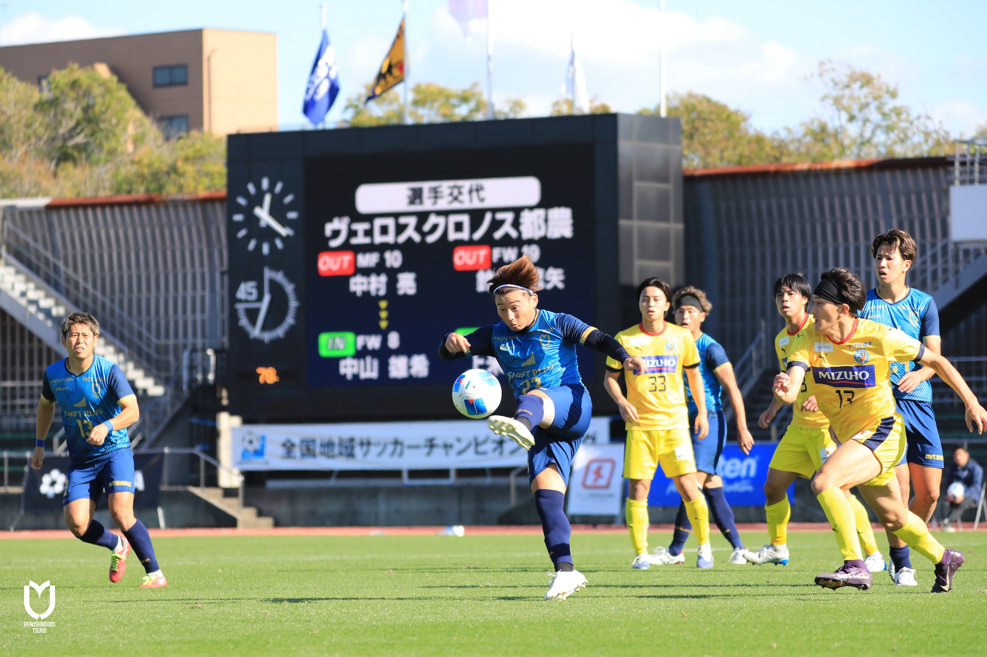 悲願のJFL昇格に向けて勝ち点3が必須のヴェロスクロノス都農は立ち上がりからボールを握る時間帯を積極的に取って敵陣深くまで攻め入り、ディフェンスへの切り替えも早く、攻守にわたってリズムを握ります。早々にDF井上将弥選手の右サイドへのロングボールをFW酒井信磨選手が折り返し、受けたMF中村亮選手がシュート。ブロックはされたものの十分にプレッシャーを与え、前線の果敢なプレスとハードワーク、井上選手やDF山原慧也選手ら最終ラインの体を張った堅守もかみ合い、ボールを優位に動かしながらすぐさま連続攻撃を仕掛けました。好機は続き、MF永野雄大選手とDF藤本奎詩選手が左サイドで陣地を進め、いったん山原選手にボールを下げた後、中央で受けたMF山内彰選手が永野選手との連係で前進を図り、右サイドの酒井選手にサイドチェンジした後、中村選手を経由して山内選手がシュートまで持ち込みました。