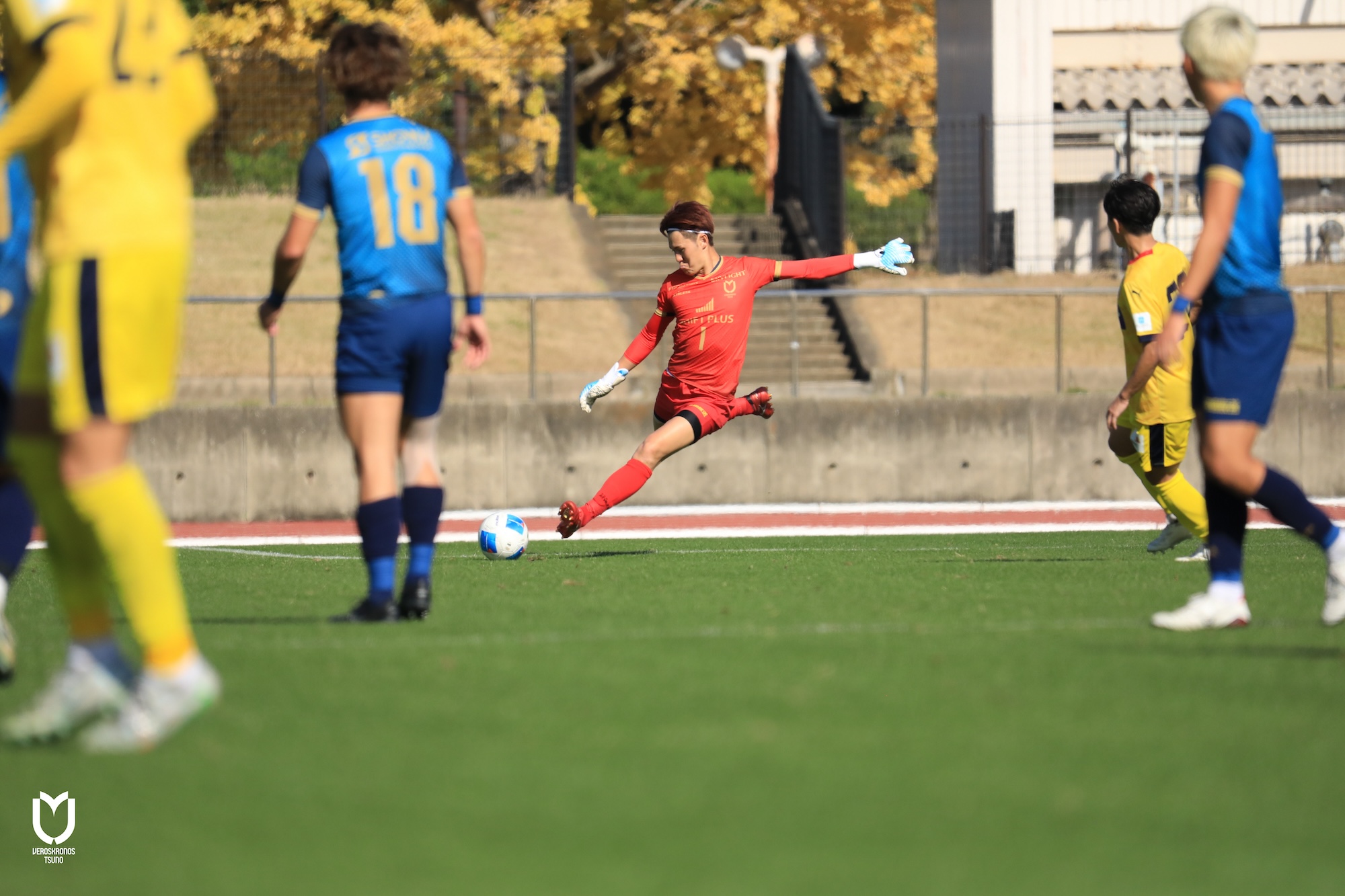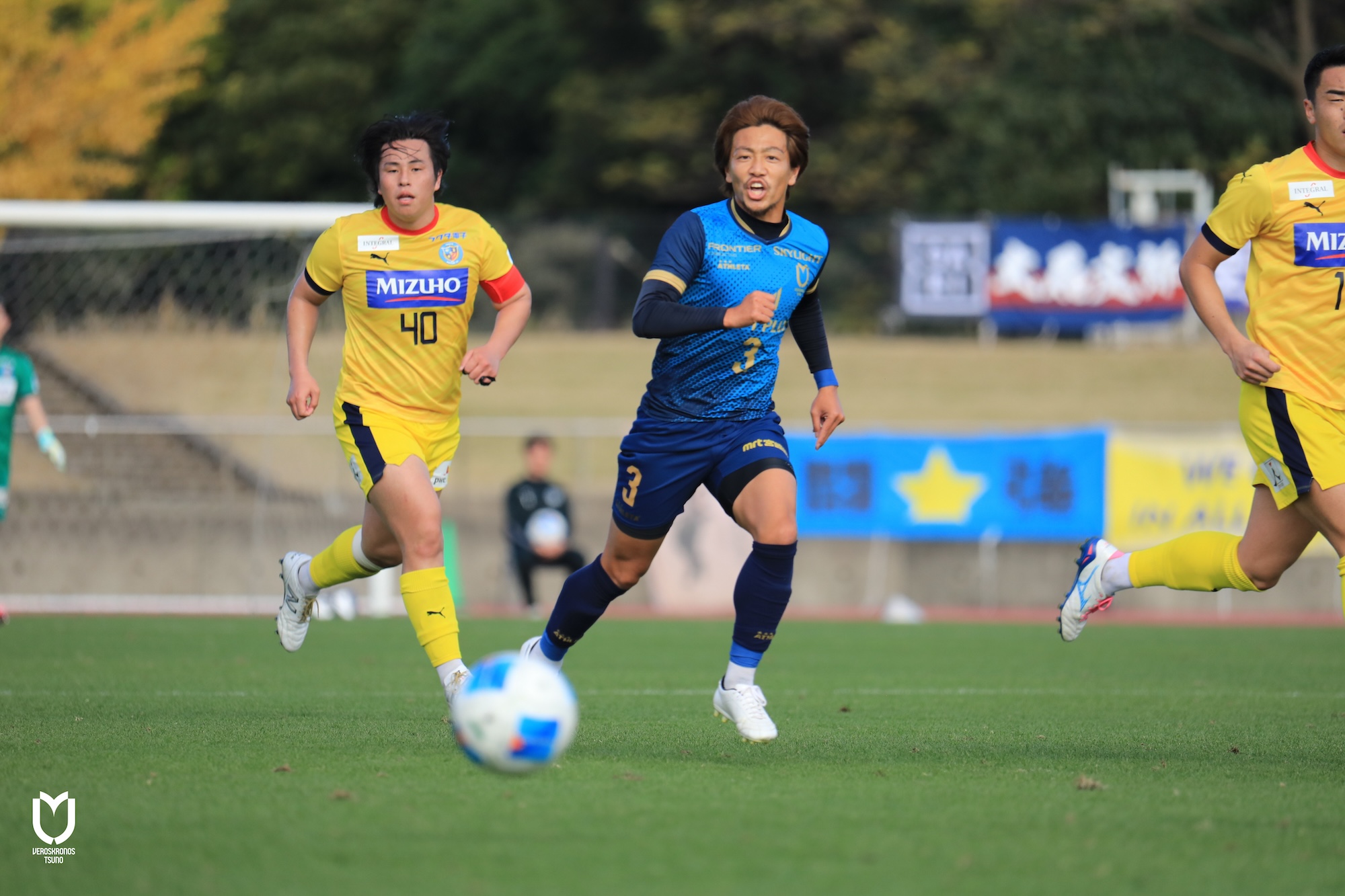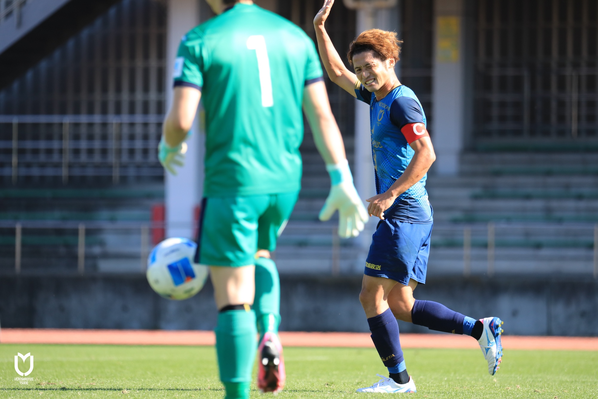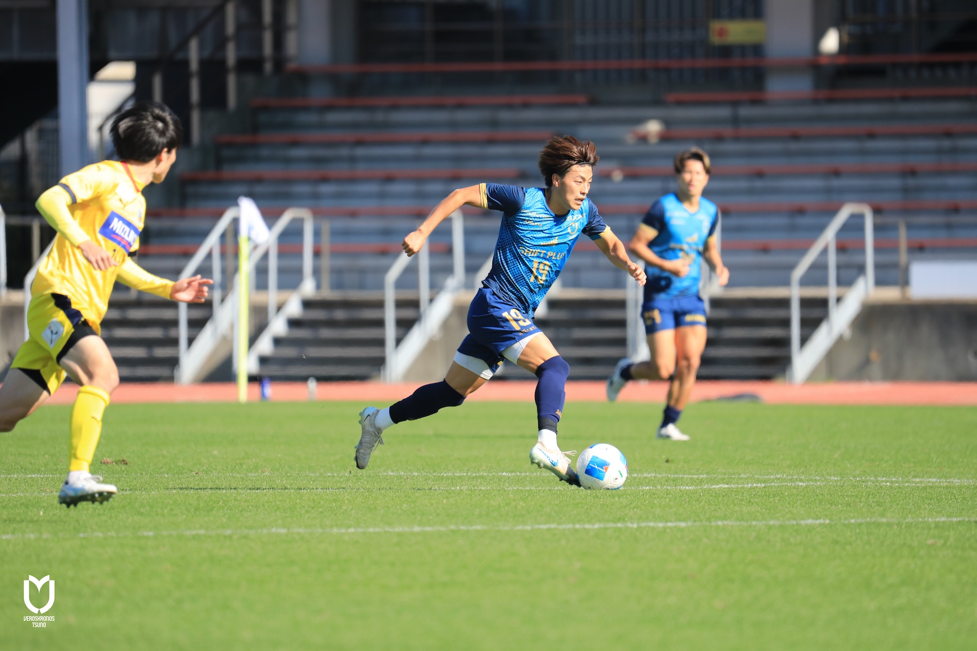 悲願のJFL昇格に向けて勝ち点3が必須のヴェロスクロノス都農は立ち上がりからボールを握る時間帯を積極的に取って敵陣深くまで攻め入り、ディフェンスへの切り替えも早く、攻守にわたってリズムを握ります。早々にDF井上将弥選手の右サイドへのロングボールをFW酒井信磨選手が折り返し、受けたMF中村亮選手がシュート。ブロックはされたものの十分にプレッシャーを与え、前線の果敢なプレスとハードワーク、井上選手やDF山原慧也選手ら最終ラインの体を張った堅守もかみ合い、ボールを優位に動かしながらすぐさま連続攻撃を仕掛けました。好機は続き、MF永野雄大選手とDF藤本奎詩選手が左サイドで陣地を進め、いったん山原選手にボールを下げた後、中央で受けたMF山内彰選手が永野選手との連係で前進を図り、右サイドの酒井選手にサイドチェンジした後、中村選手を経由して山内選手がシュートまで持ち込みました。