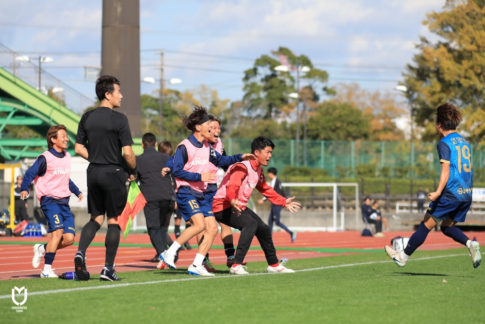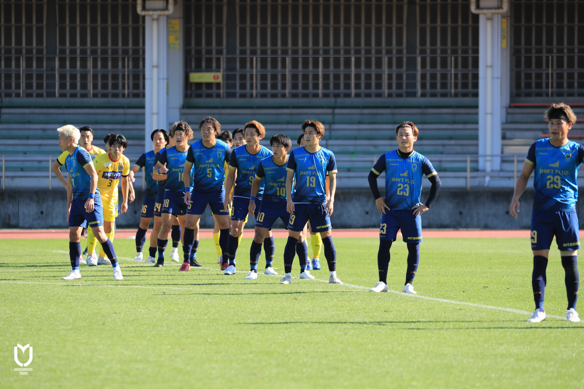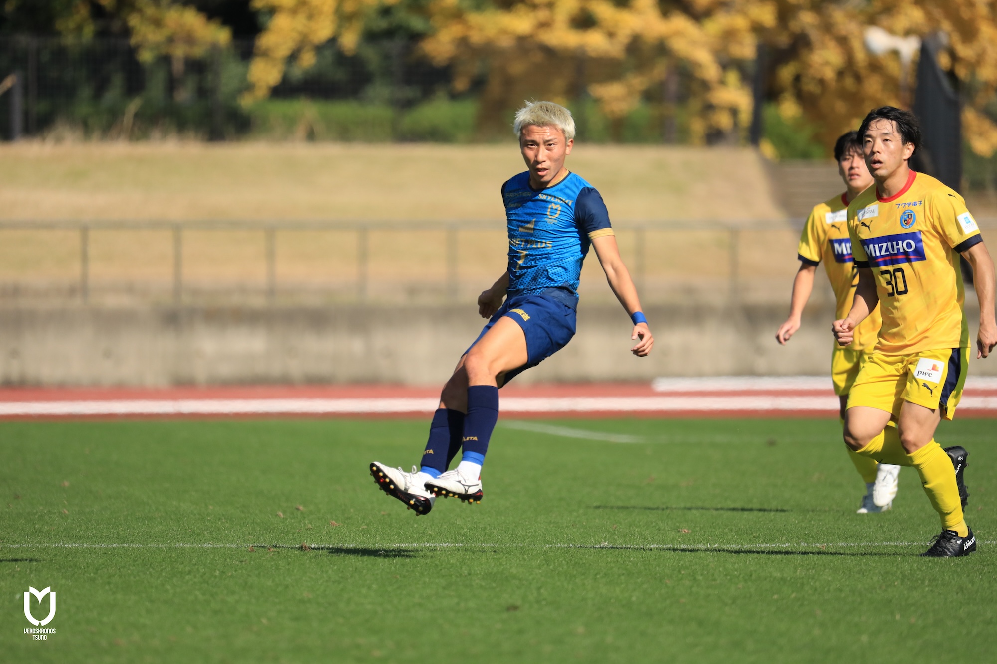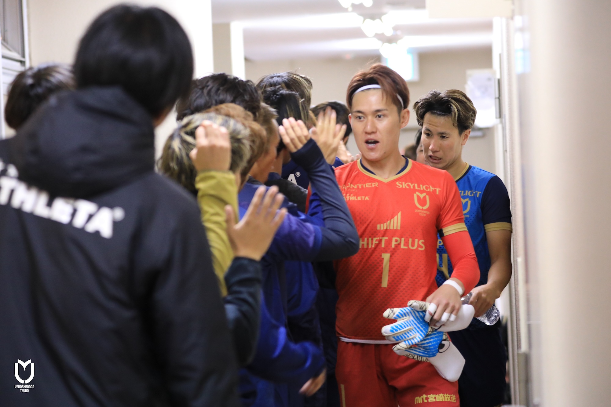 悲願のJFL昇格に向けて勝ち点3が必須のヴェロスクロノス都農は立ち上がりからボールを握る時間帯を積極的に取って敵陣深くまで攻め入り、ディフェンスへの切り替えも早く、攻守にわたってリズムを握ります。早々にDF井上将弥選手の右サイドへのロングボールをFW酒井信磨選手が折り返し、受けたMF中村亮選手がシュート。ブロックはされたものの十分にプレッシャーを与え、前線の果敢なプレスとハードワーク、井上選手やDF山原慧也選手ら最終ラインの体を張った堅守もかみ合い、ボールを優位に動かしながらすぐさま連続攻撃を仕掛けました。好機は続き、MF永野雄大選手とDF藤本奎詩選手が左サイドで陣地を進め、いったん山原選手にボールを下げた後、中央で受けたMF山内彰選手が永野選手との連係で前進を図り、右サイドの酒井選手にサイドチェンジした後、中村選手を経由して山内選手がシュートまで持ち込みました。