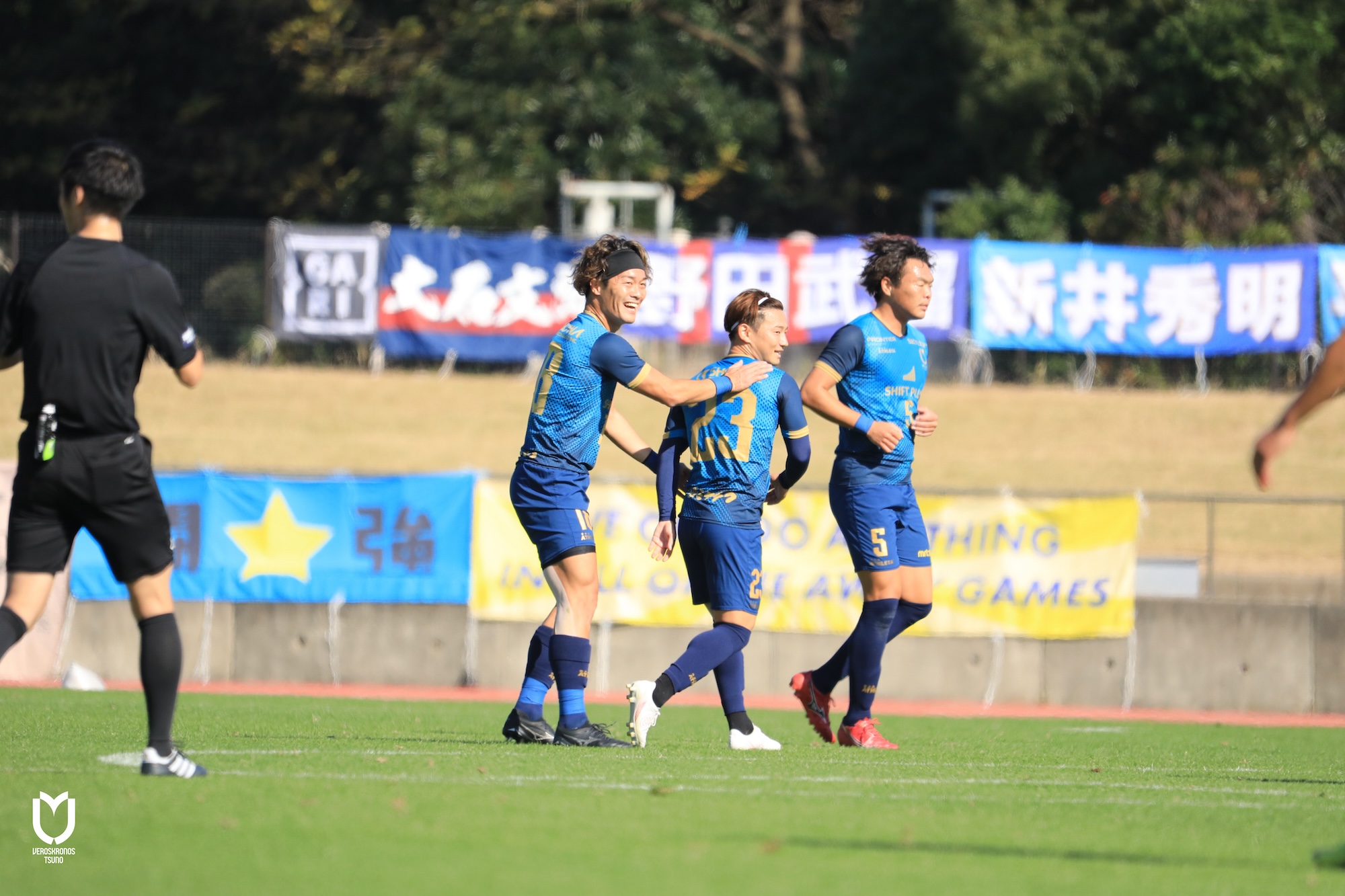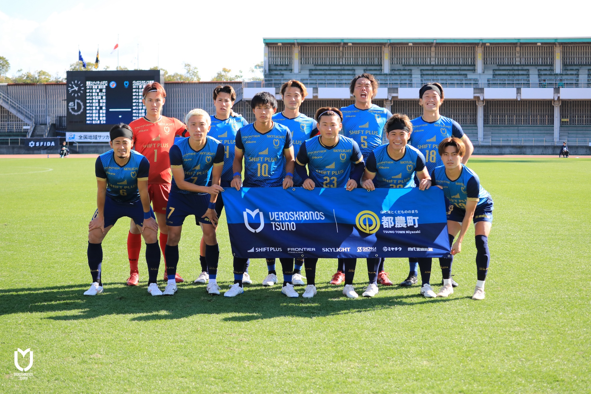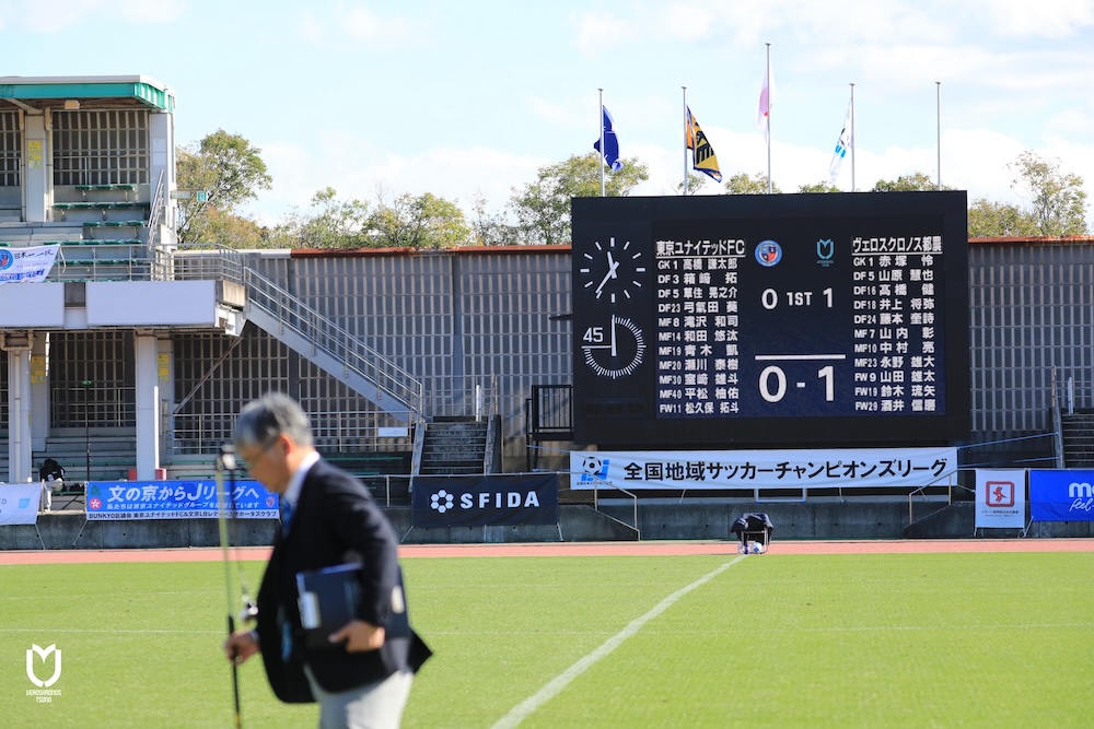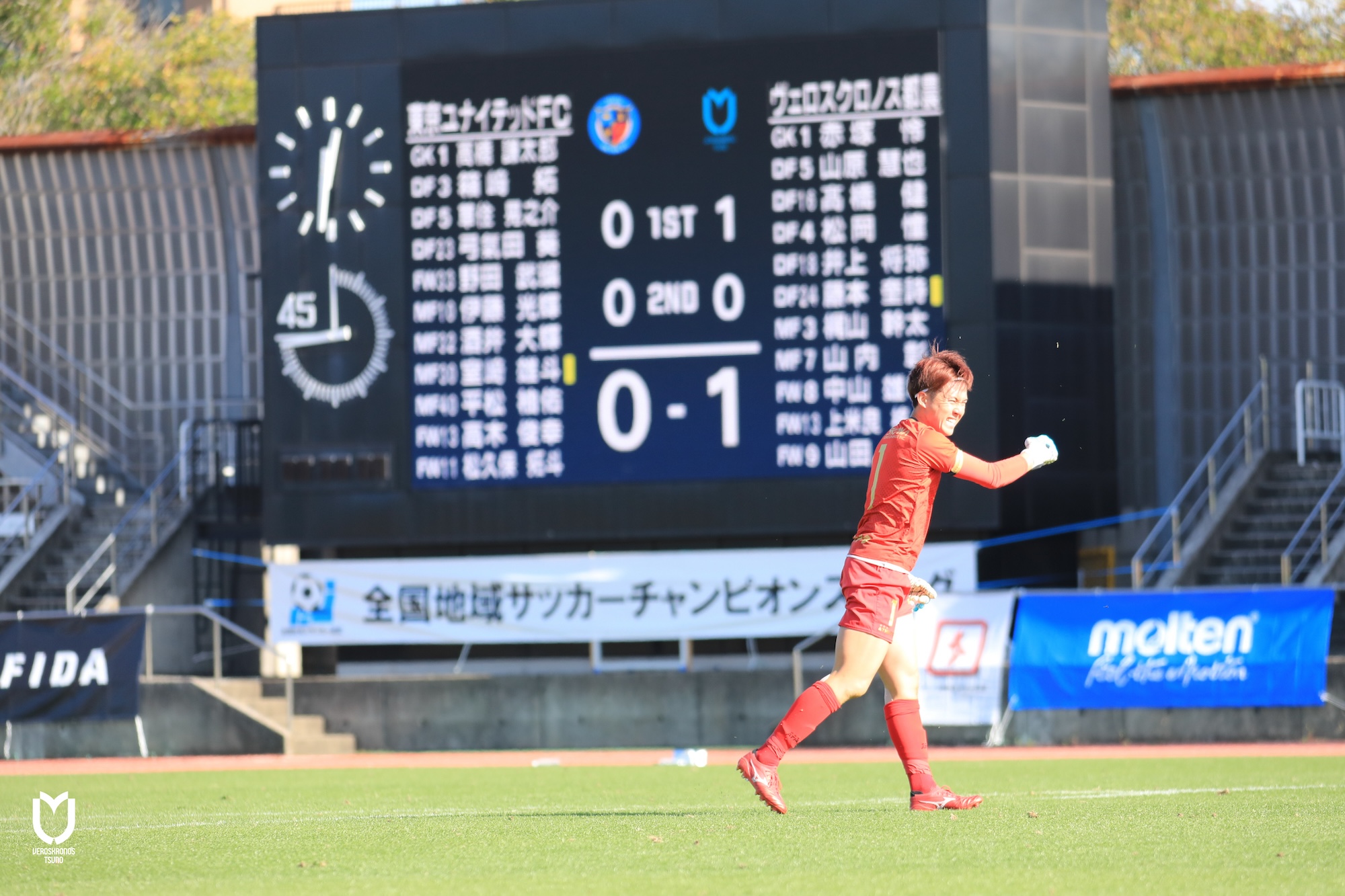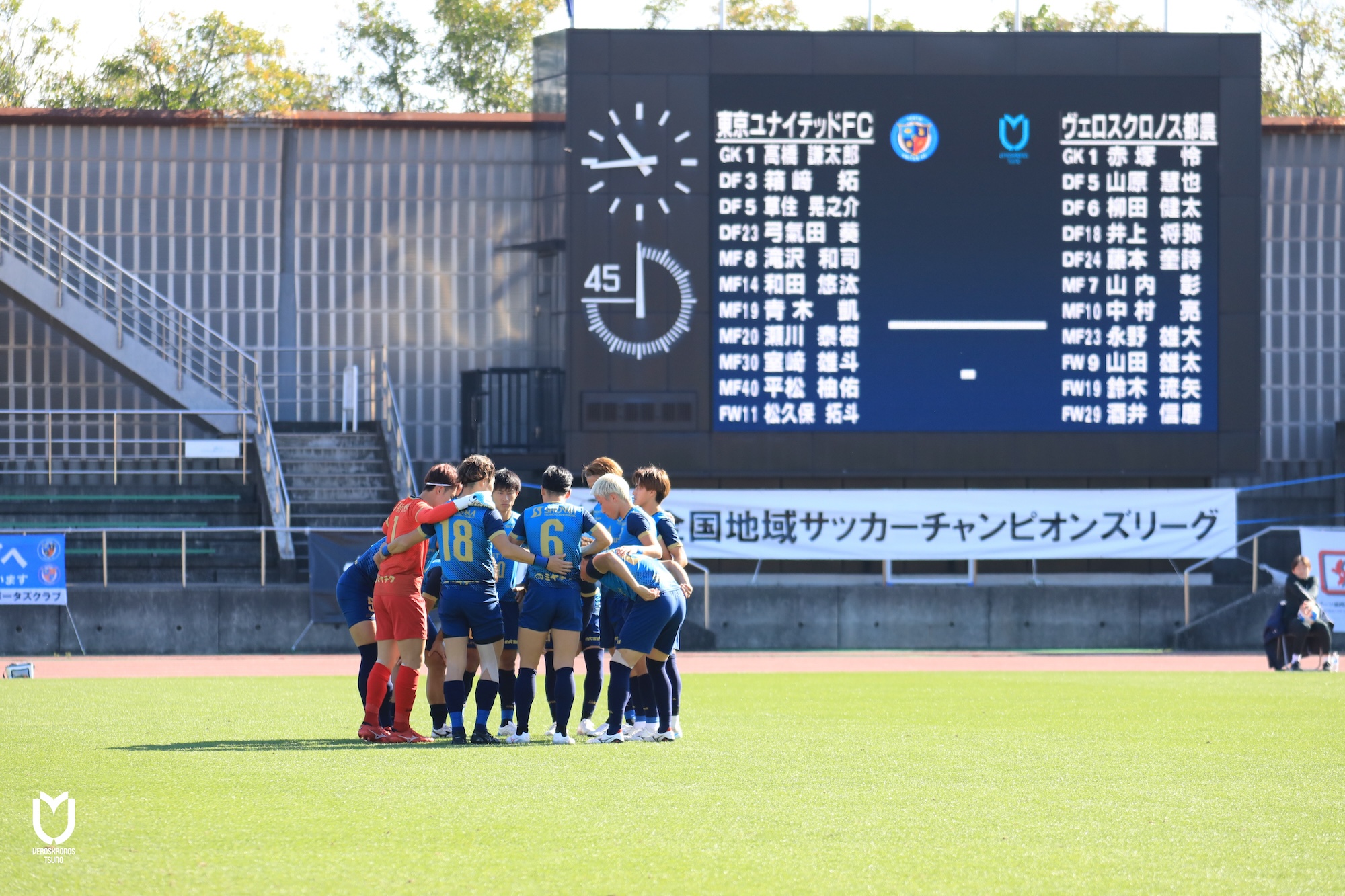 日本フットボールリーグ(JFL)昇格を争う全国地域サッカーチャンピオンズリーグ(地域CL)の決勝ラウンド第2日は11月22日(土)、千葉県市原市のゼットエーオリプリスタジアムで2試合が行われ、ヴェロスクロノス都農は2―1で東京ユナイテッドFC(関東)に競り勝ち、通算成績を1勝1分けの勝ち点4に伸ばしました。2試合目で勝利しました2位ジェイリースFC(九州)と勝ち点、得失点差で並びましたが、総ゴール数で1つ上回り、2日目を終えて首位に立ちました。