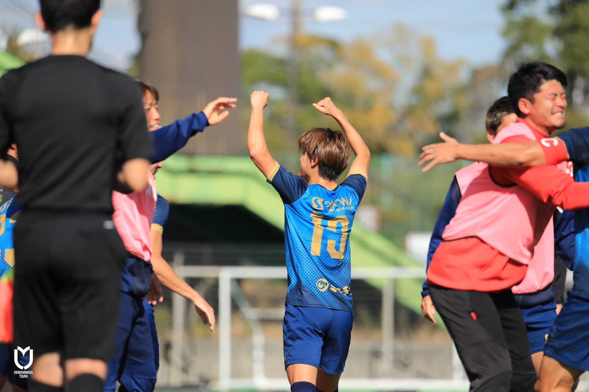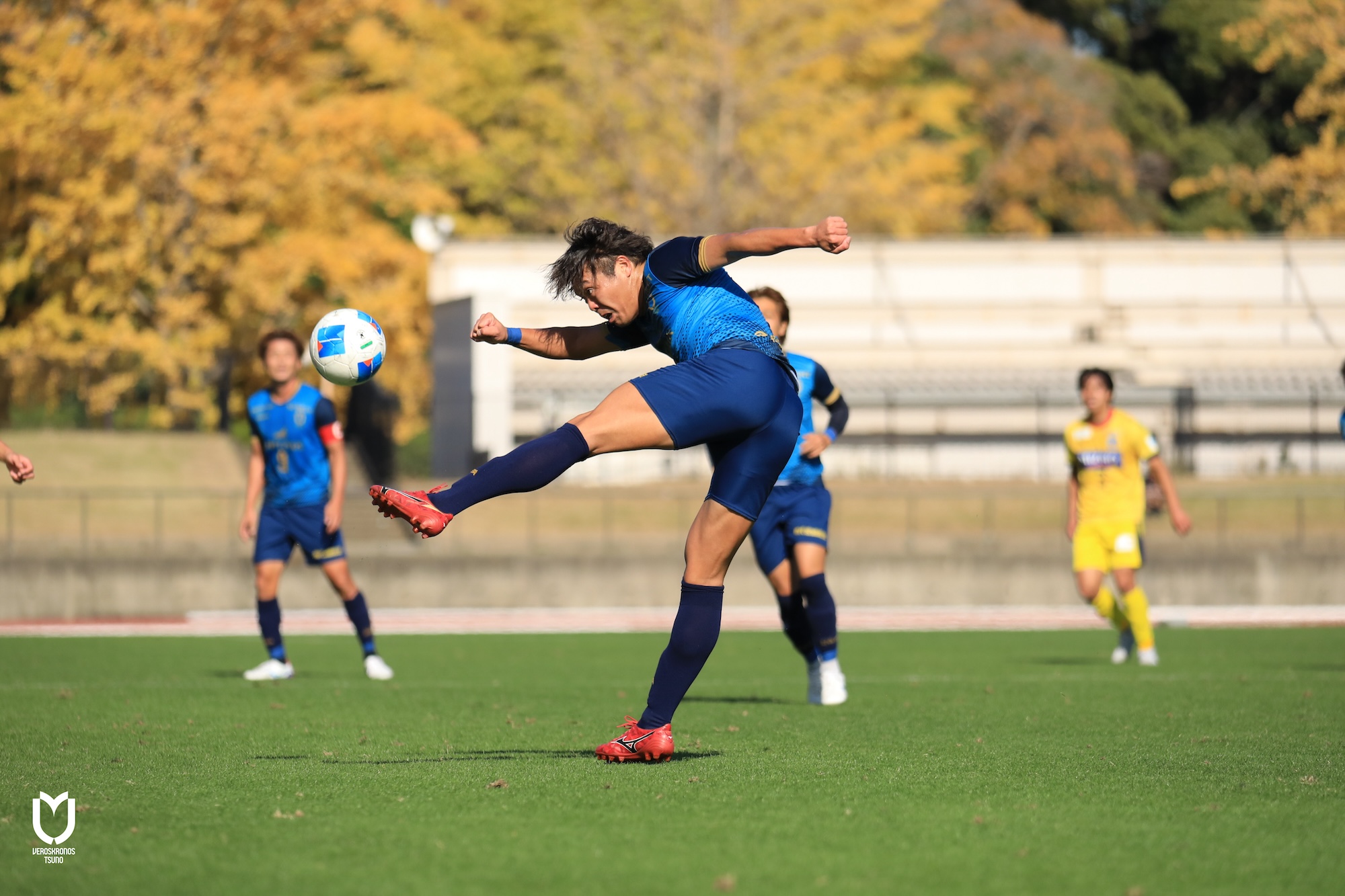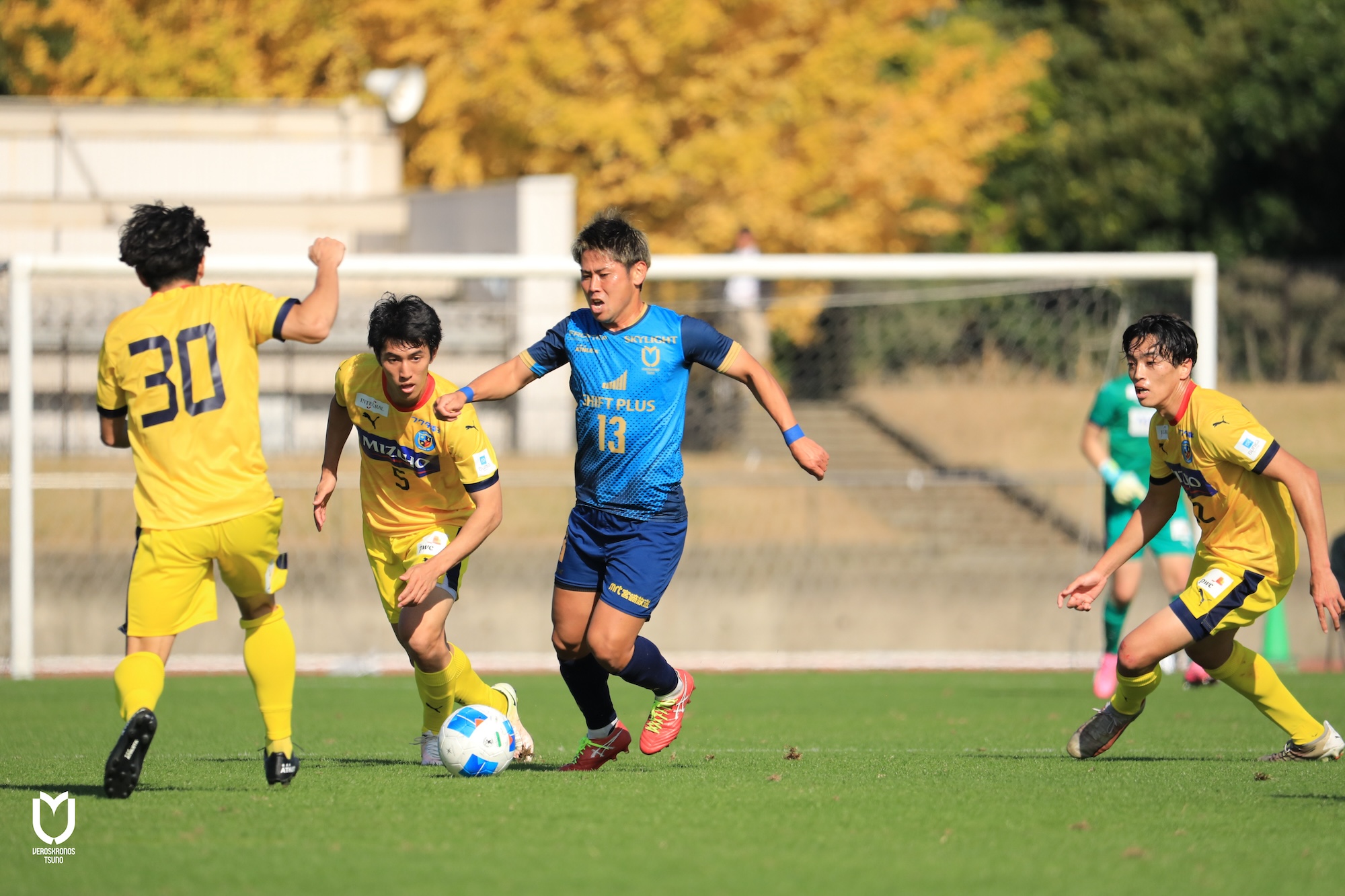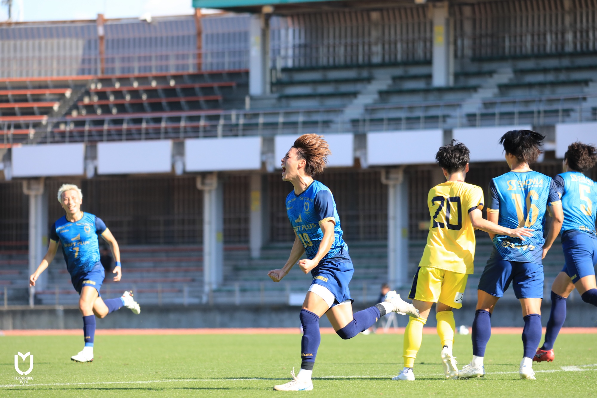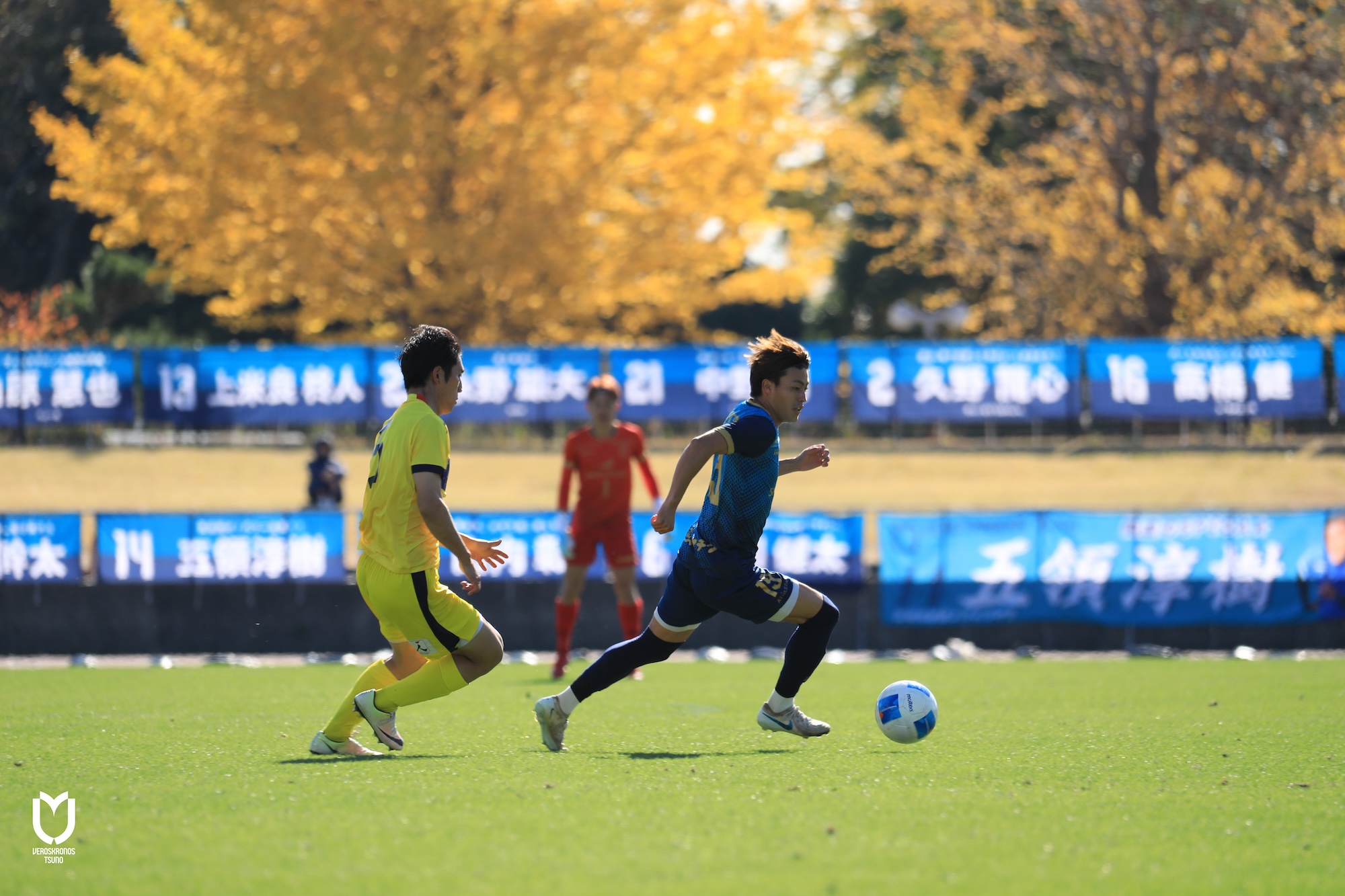 徹底した粘り強い守備を繰り広げながら、少ない攻撃機会の中で相手ディフェンスの隙を伺い続けると、45分に山田選手とFW上米良柊人選手らが中盤でのボール争奪戦に競り勝ってカウンター攻撃の好機を得ます。上米良選手からボールを託された後半34分に右ウイングに入ったFW中山雄希選手が中央から右サイドに動きを変化させながら一気に駆け上がり、再び中央へと鋭く切り返してペナルティーエリアに侵入しシュート態勢に入ろうとしたところで相手DFが足を掛けてファウルを犯し、試合終了を目前にして値千金のPKを獲得しました。自らの積極的な仕掛けから得た絶好機を左足で冷静に仕留めて2―0とすると、さらに相手が前掛かりとなって猛攻を受けました。懸命に耐えましたが、アディショナルタイム3分にゴール前の混戦で生まれた一瞬の隙を突かれて得点を許しました。残り時間1分での手痛い失点となりましたが、それ以上の反撃は許さず2―1のまま逃げ切りました。