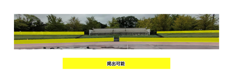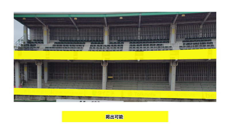 ・横断幕の掲出可能エリアは、バックスタンドならびにゴール裏の指定場所(下図参照)のみです。メインス タンドへの掲出は禁止です。※天候(強風等)により主管判断で掲出をお断りする場合がございます。