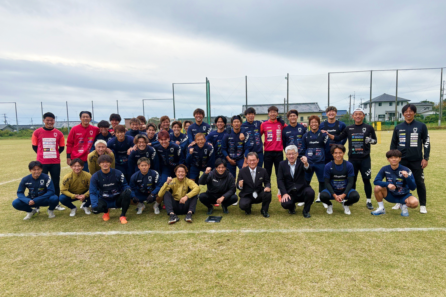 ホームタウン都農町の坂田広亮町長、瀬尾隆太副町長が全国地域サッカーチャンピオンズリーグ1次ラウンド突破の労いと、11月20日(木)に開幕する決勝ラウンドに向けた激励のため、トレーニング会場の「つのこう広場」にお越しくださいました。