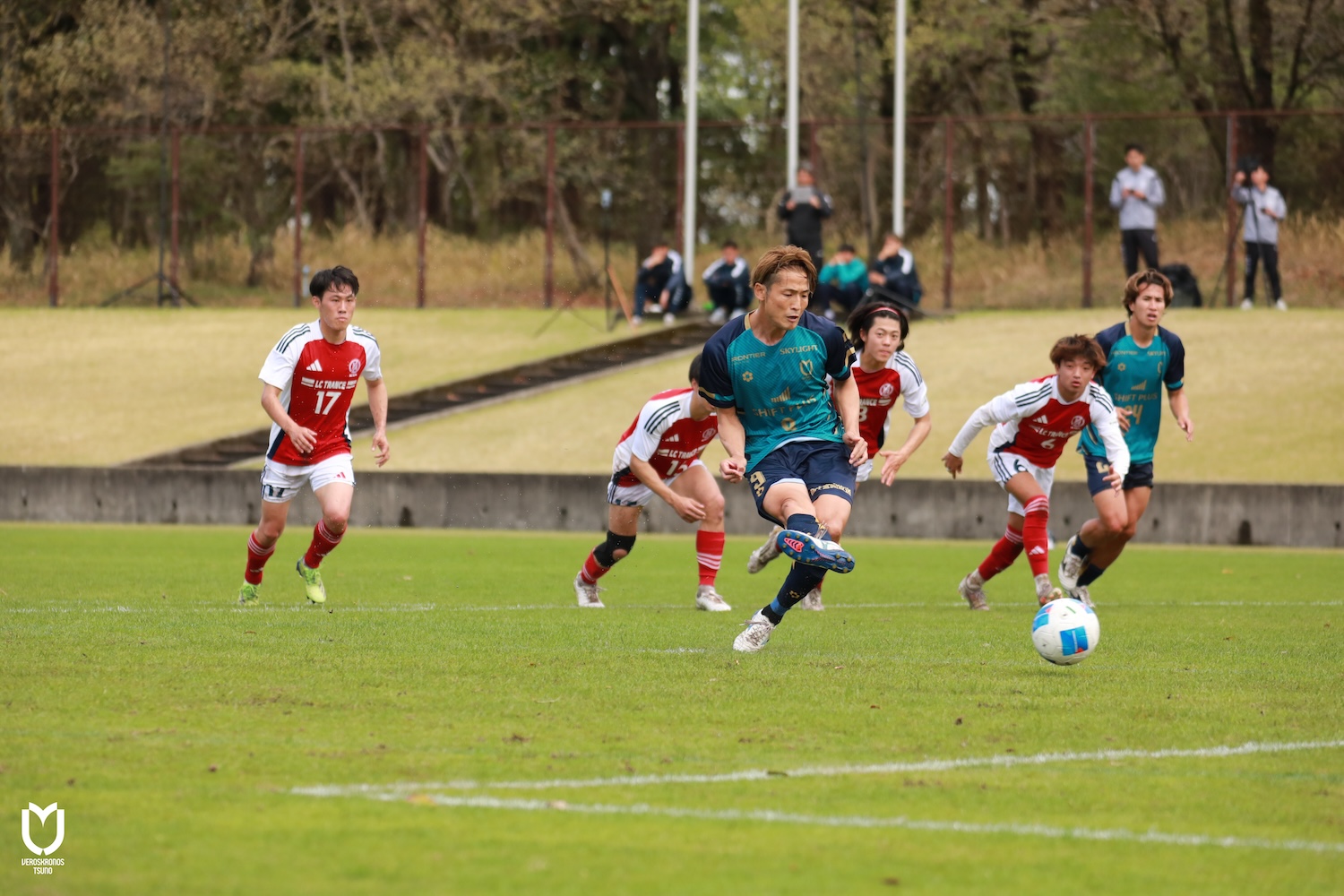 もどかしい空気感を打破したい中、迎えた19分に山田隼輔選手が左サイドを突いた縦パスを鈴木選手が収め、相手マークを交わした後に託した五領選手が粘ってボールを確保し左の大外に位置したDF藤本奎詩選手に委ねると、ペナルティーエリア内へと切り込んだ鋭い動きが相手ファウルを誘ってPKを獲得しました。